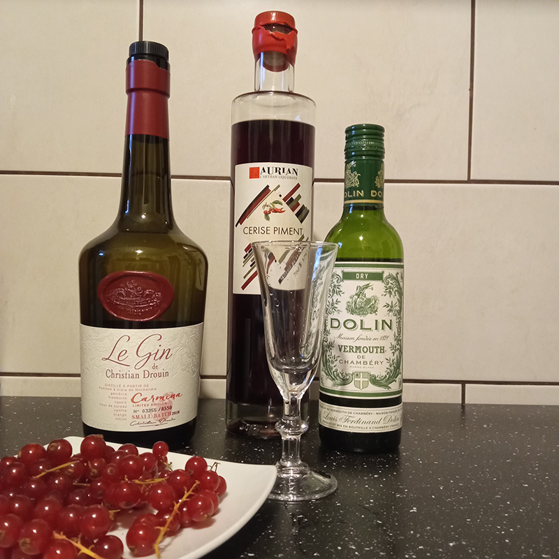 Inspired by Joerg Meyer’s recipe called “1920 Cocktail” (~2016)… here the Kirsch is replaced by the Cherry Piment Aurian liqueur and some crushed fresh currant.