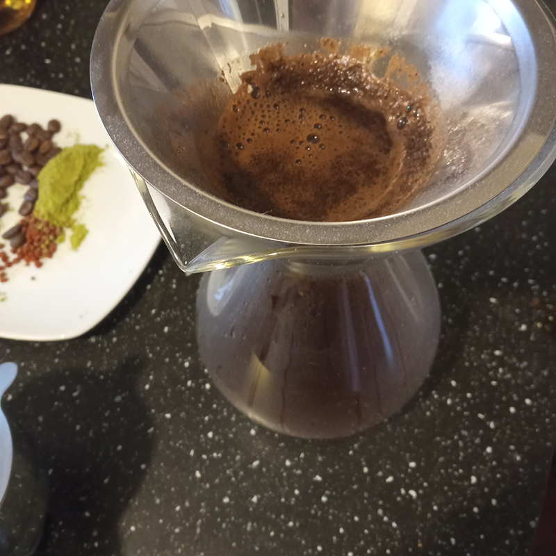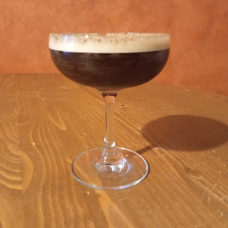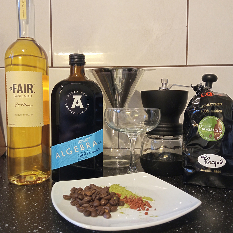 4 cl vodka – FAIR Barrel Aged1,5 cl Algebra Extra Dry Coffee liqueur8 cl Café Bacquié Vilcabambagarnish : wheatgrass powder, coffee beans, Annatto seeds