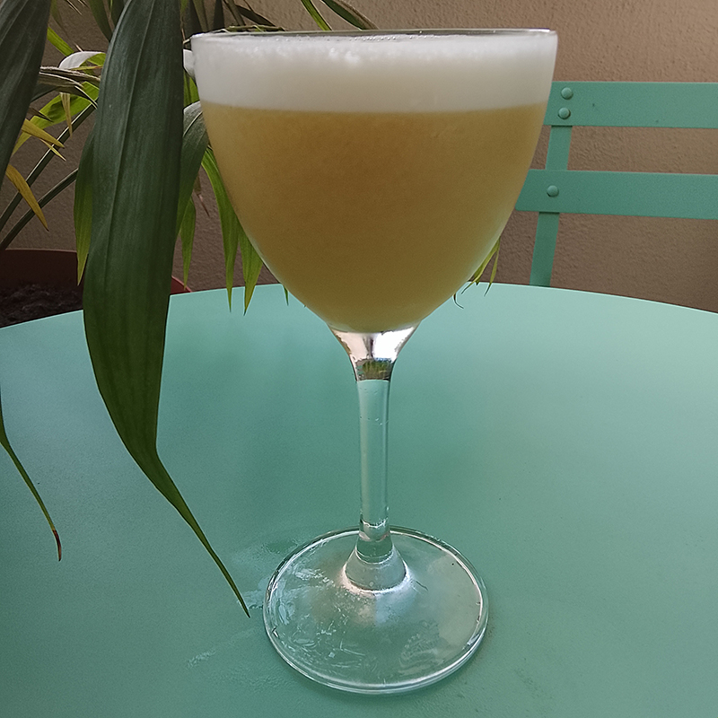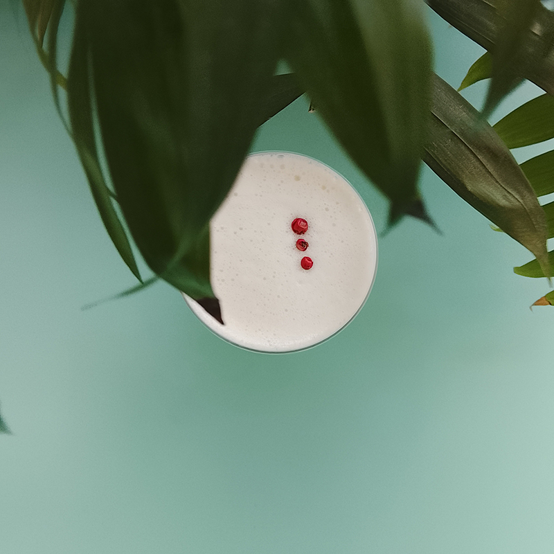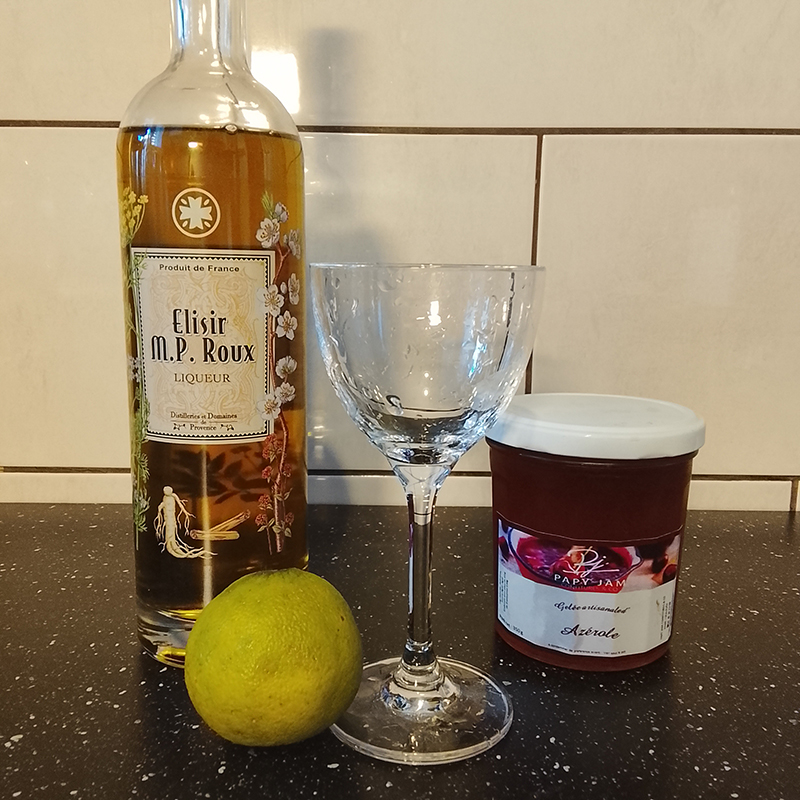 5 cl Élisir MP Roux – Distilleries de Provence1 barspoon de gelée d’ azéroles Papy Jam2 cl limeeggwhite, baies roses