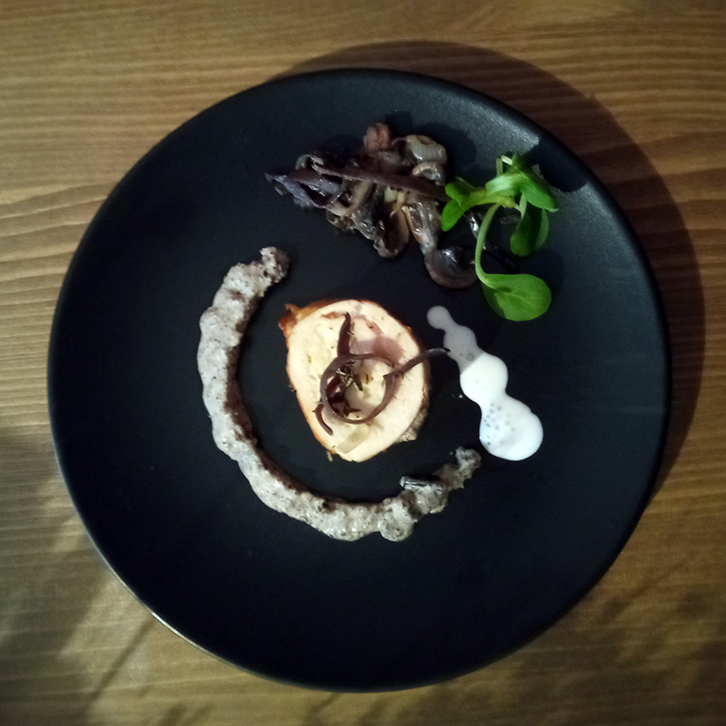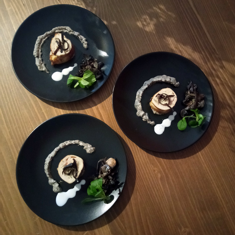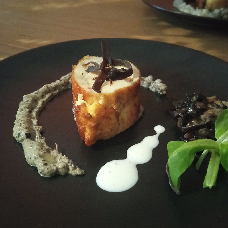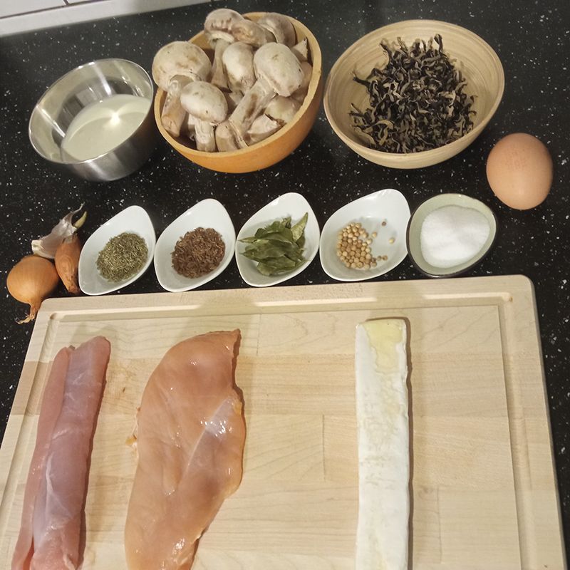 Ballotines of chicken and turkey, brie, cream, mushrooms, shallot, onion, garlic, thyme, caraway, kaloupile, smoked white pepper, salt, egg.