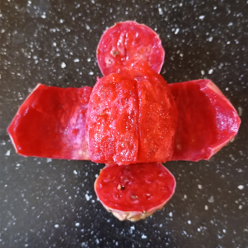 5 cl Liqueur de figue – Distillerie du Périgord1,5 cl lime1/2 barspoon Confit de Pétales de Rose – Eric Bur1 figue de Barbarie (prickly pear)