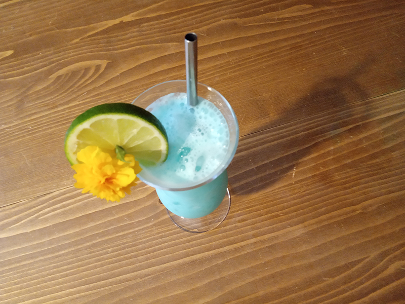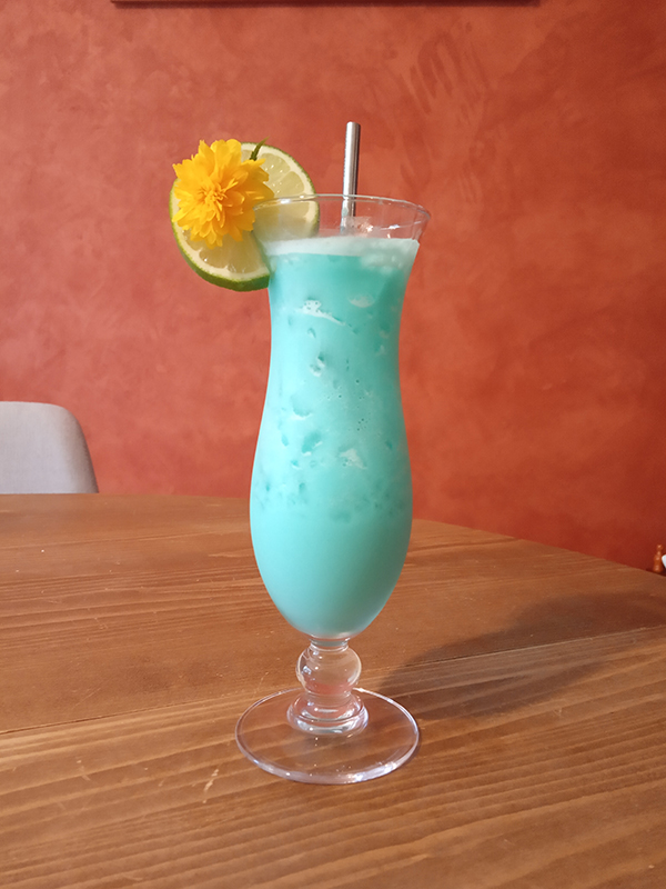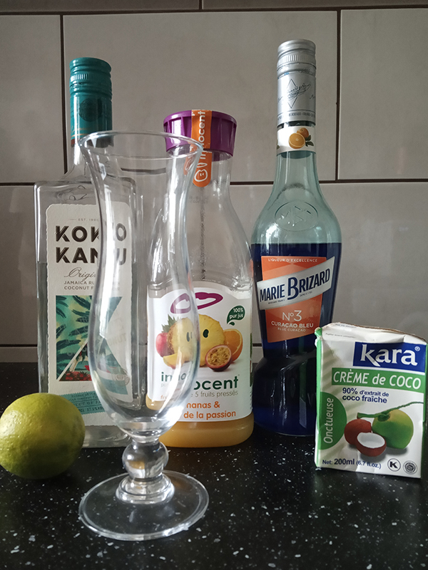 (Don the Beachcomber) 4,5 cl Koko Kanu Rum 2,25 cl Blue Curaçao Marie Brizard 8 cl pineapple/passion fruit juice Innocent0,75 cl lime2,25 cl Crème de coco – Kara