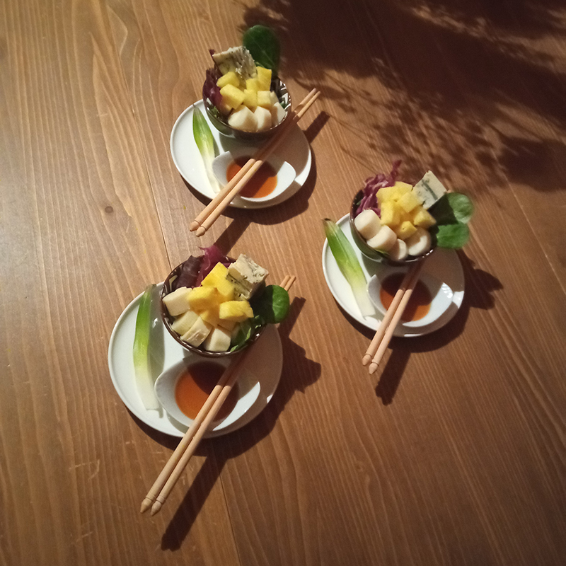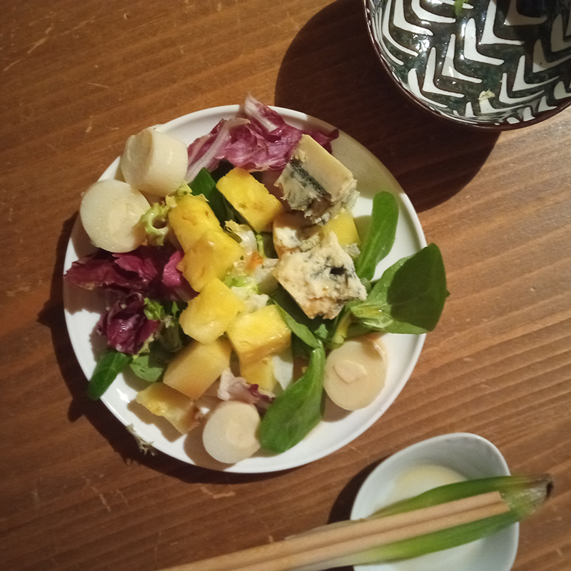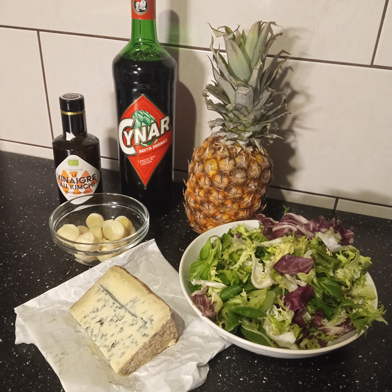 pineapple, hearts of palm, Bleu d’Auvergne, lettuce (frisée – lamb’s lettuce – red chicory – arugula), Kimchi vinegar (La Préserverie), Cynar