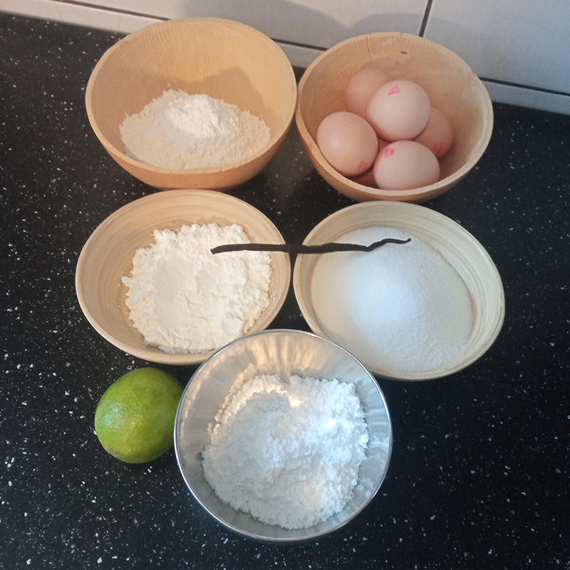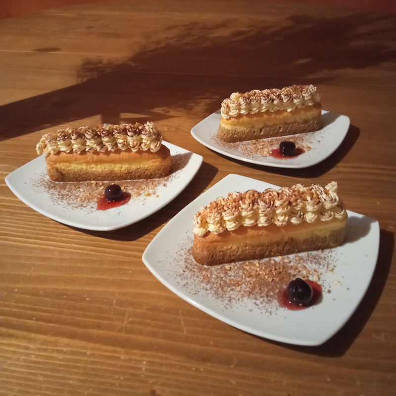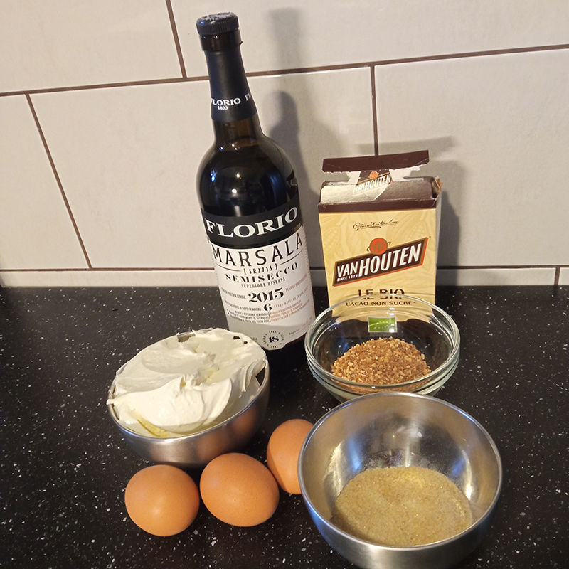 flour, eggs, salt, starch, vanilla, lime, sugar, coffee, praline, chocolate powder, Amarena Fabbri cherries, mascarpone, Marsala Florio.