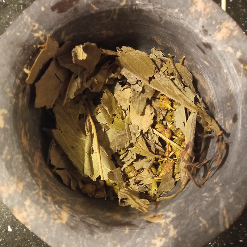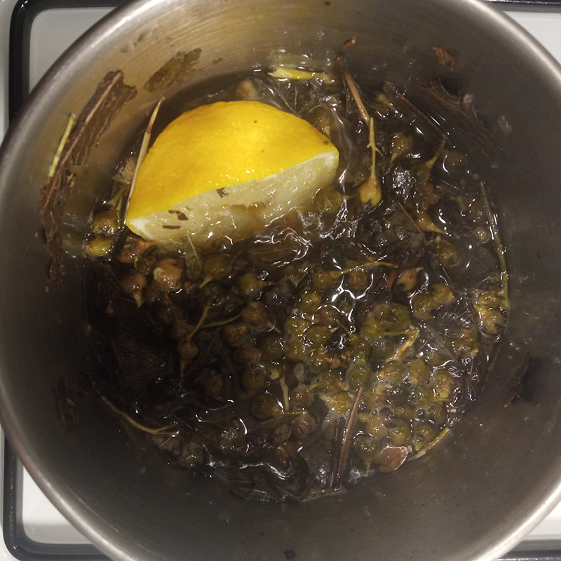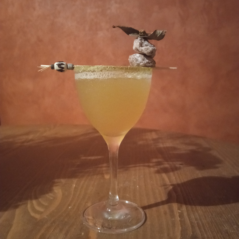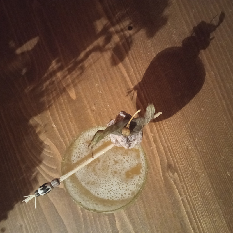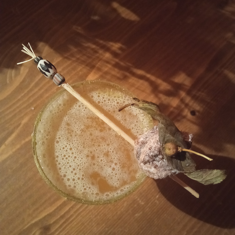 5 cl – Ceder’s Wild10 cl homemade cordial with kinkeliba and passion berrygarnish : salted dried white plums and djoumgblé (okra/gombo powder)
