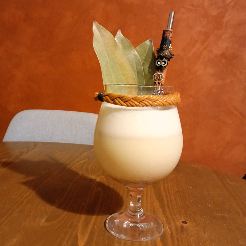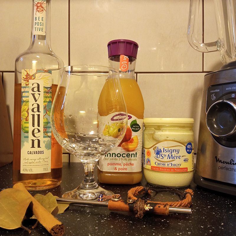 8 cl Avallen Calvados5 cl Crème d’Isigny Sainte Mère AOP30 cl Fruit juice – apple, peach, pear – Innocenta pinch of grated Ceylon cinnamoncinnamon tree leaves for garnish