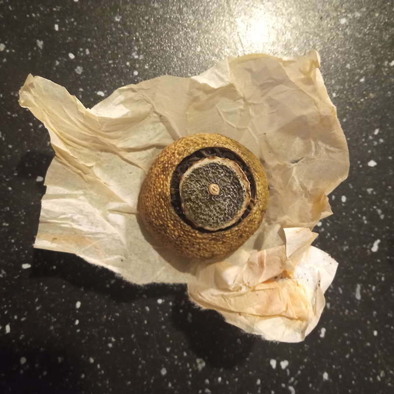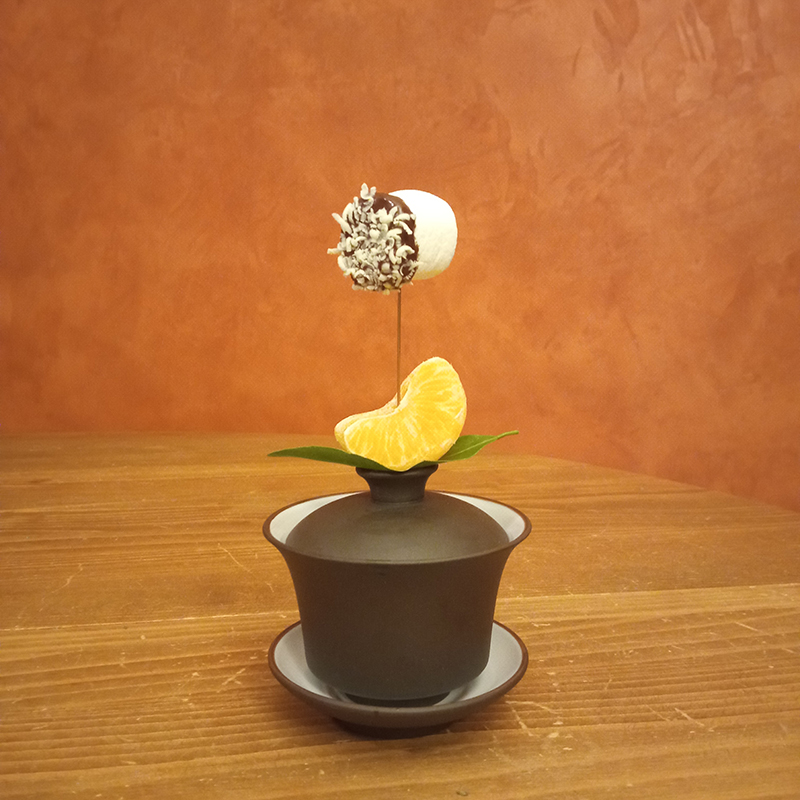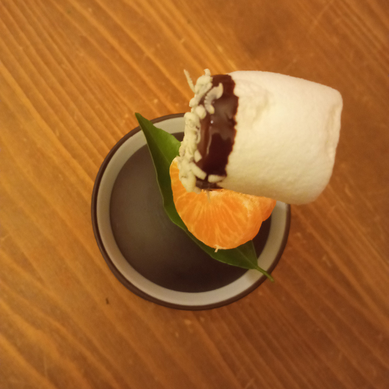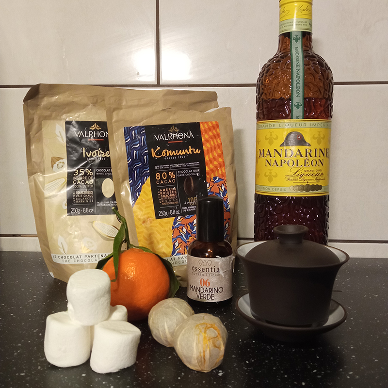 Liqueur Mandarine Napoléon, Thé Pu-erh Shu Mandarine, Essentia mandarino verde, clémentine, marshmallow, chocolat noir 80% “Komuntu” Valrhona, chocolat blanc 35% “Ivoire” Valrhona