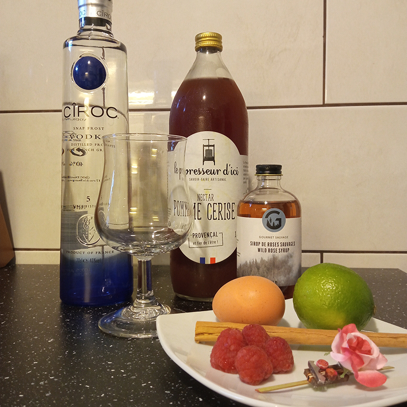 4 cl vodka – Cîroc2 cl lime1,5 cl wild rose syrup – Gourmet Sauvage – Kanata12 cl nectar pomme cerise – Le Presseur d’Ici – Sojufel – Pressoirs de provenceeggwhitegrated cinnamon + one raspberry