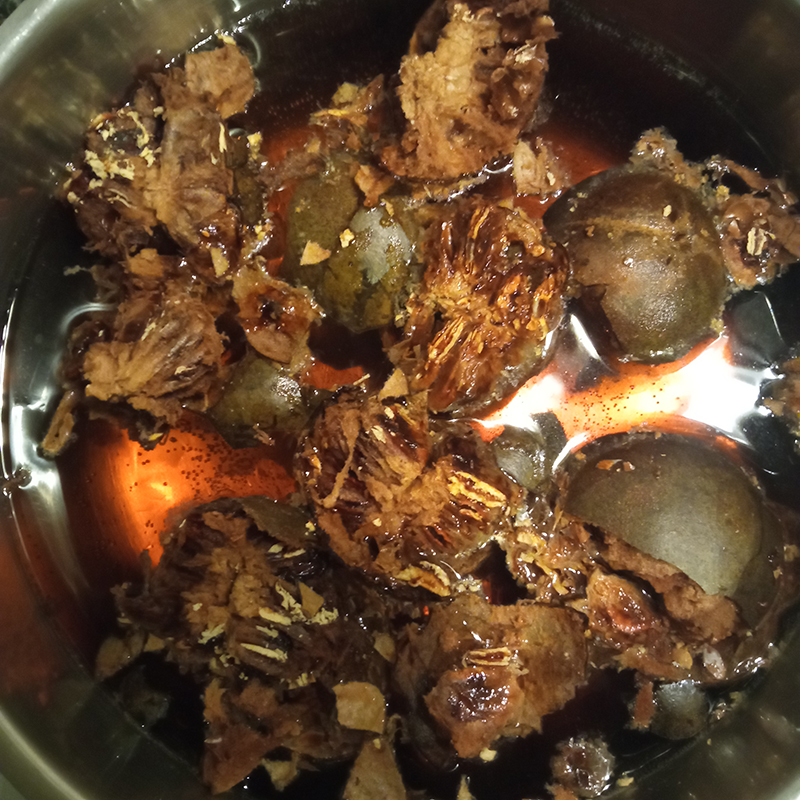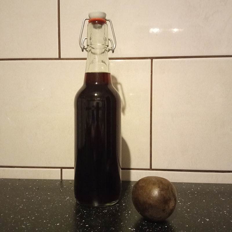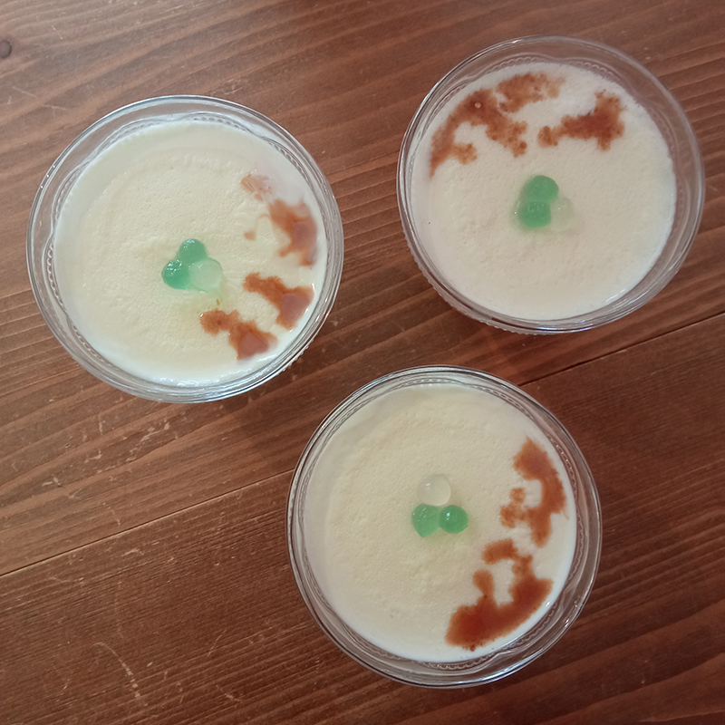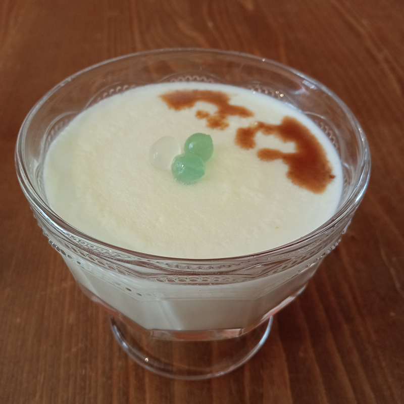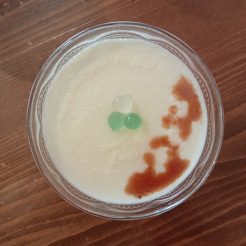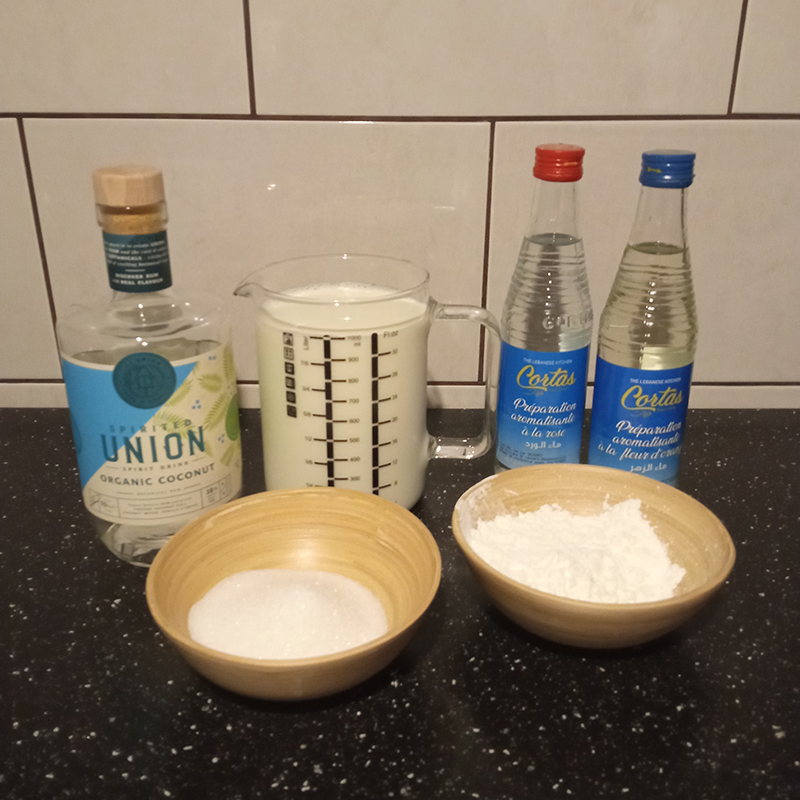 Milk, cornstarch, sugar, rose water and orange blossom water, homemade syrup with luo han guo and cola nut, bubble tea boba lychee and green apple, Rhum Coco by Spirited Union.