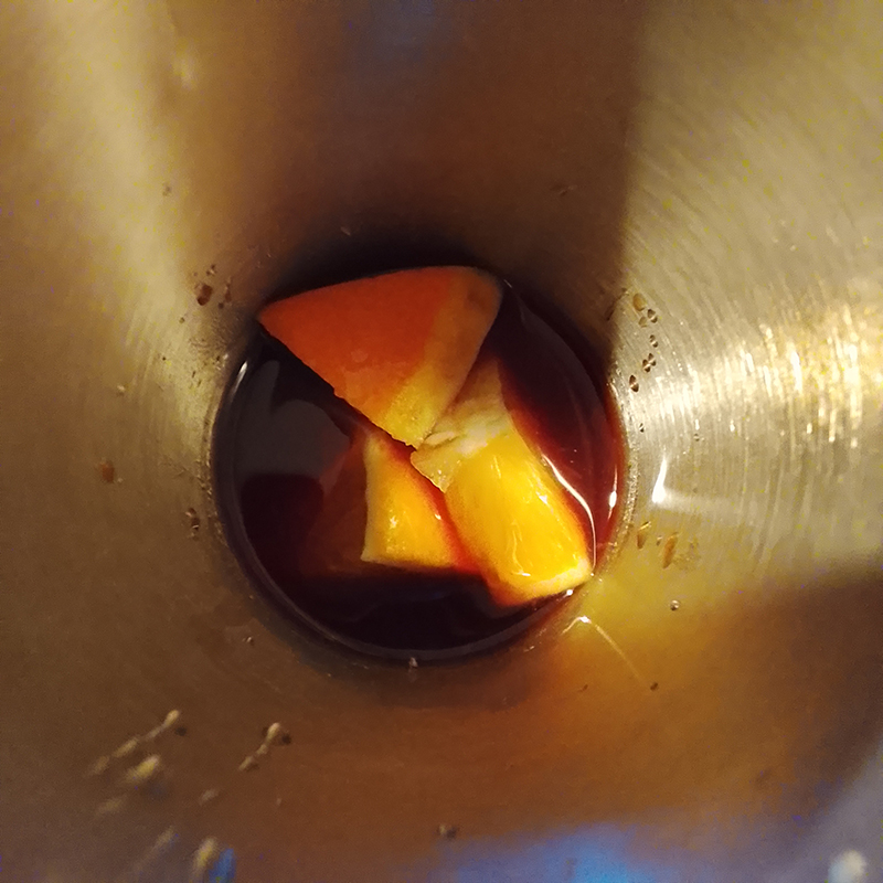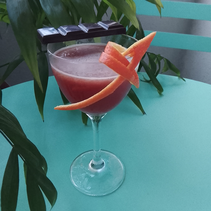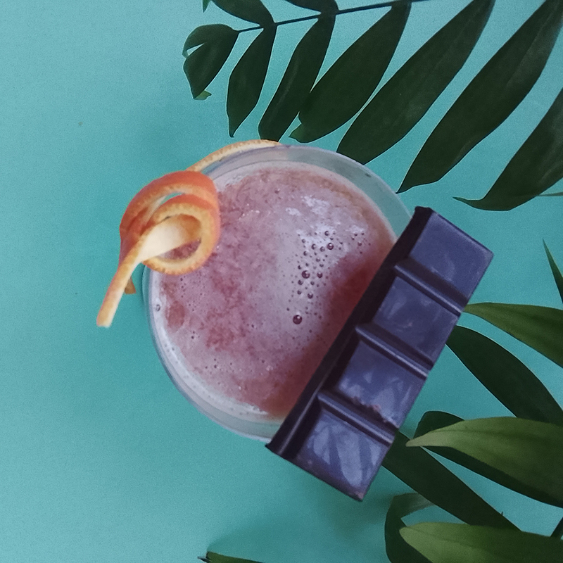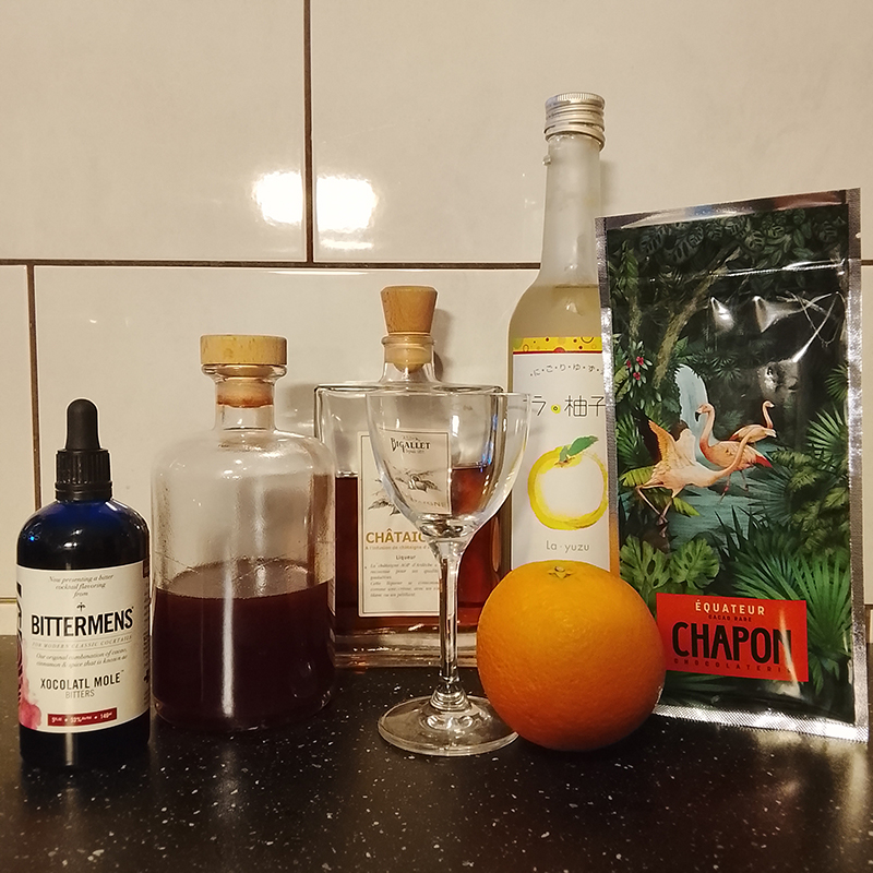 5 cl Cocoa Butter Bitter2 cl “La” Yuzu Liqueur – Godo Shushei2 cl Liqueur de Châtaigne – Bigallet2 crushed orange wedges2 dashes Xocolatl Mole Bitter – Bittermensgarnish : Chapon Chocolate – Guayaquil, Equateur