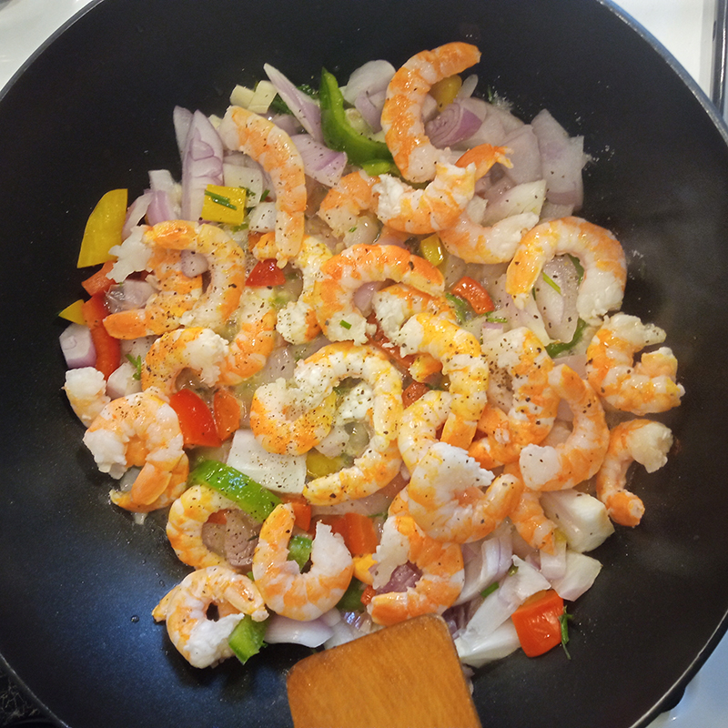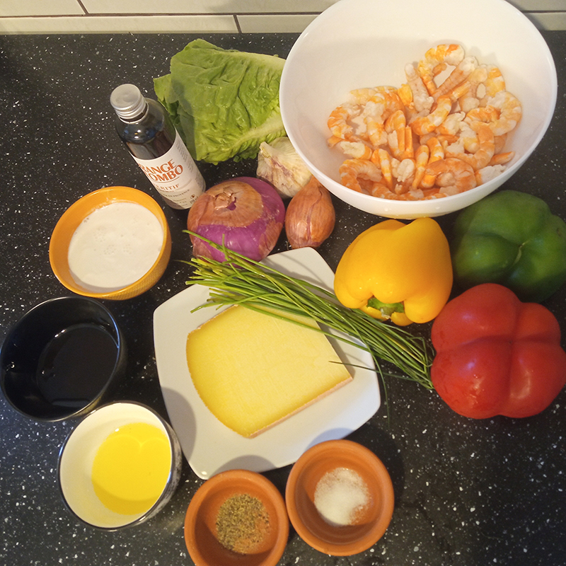 shrimps, peppers, red onion, shallot, purple garlic, chives, sesame oil, thyme honey, salt, pepper, coconut milk, “Comté”, Orange Colombo (Distilleries et Domaines de Provence), “craquerelle du Midi” (sucrine)…