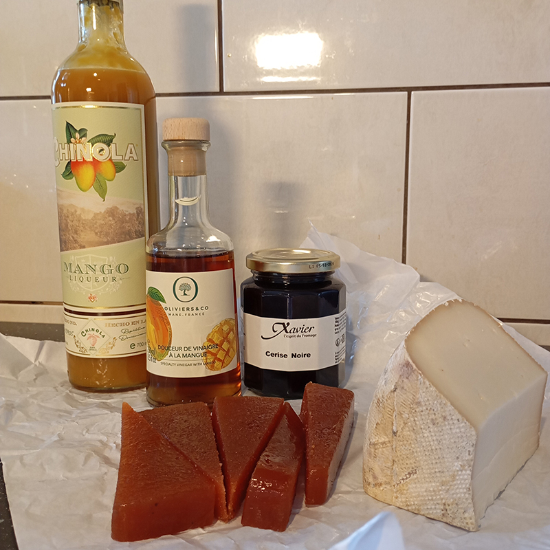 Pâte de coing, fromage AOP Ossau-Iraty Béarnais, liqueur Chinola mangue, Douceur de vinaigre à la mangue Oliviers&Co, Confiture de cerise noire – L’épicurien/Fromagerie Xavier
