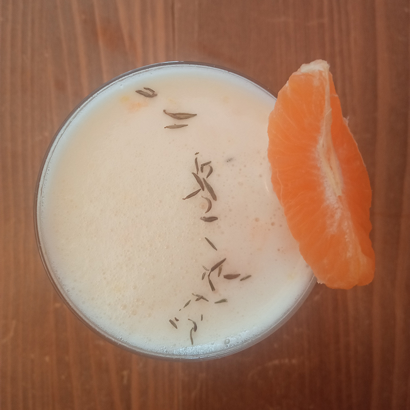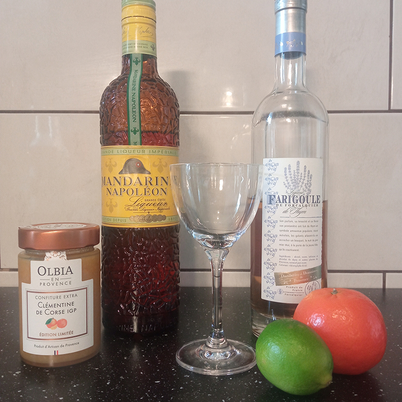 4 cl Farigoule1,5 cl Liqueur Mandarine Napoléon1 cl lime1 barspoon of Confiture artisanale de Provence – Clémentine de Corse – Olbia3 crushed Clémentine wedges1 eggwhite