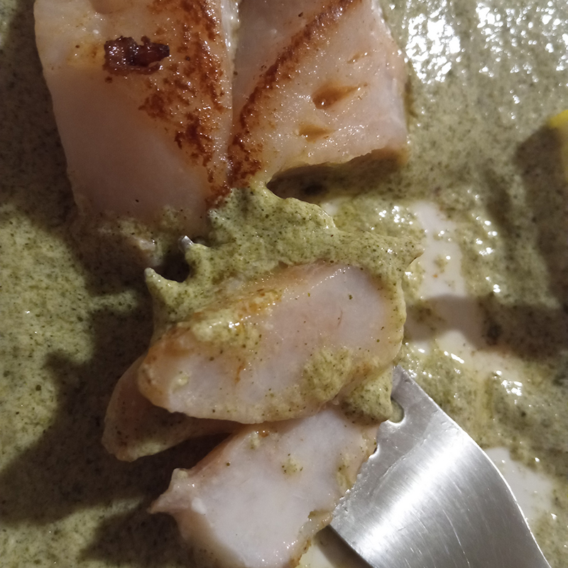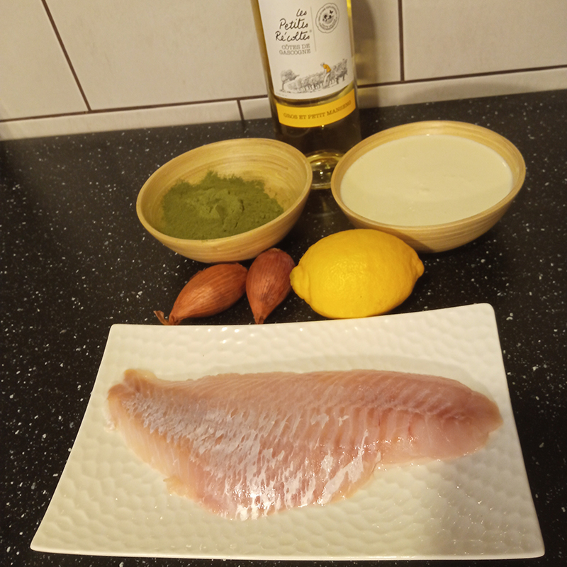 Fillet of sea bream, molokheya, shallot, lemon, fresh cream, white wine “Les Petites Récoltes – Manseng”