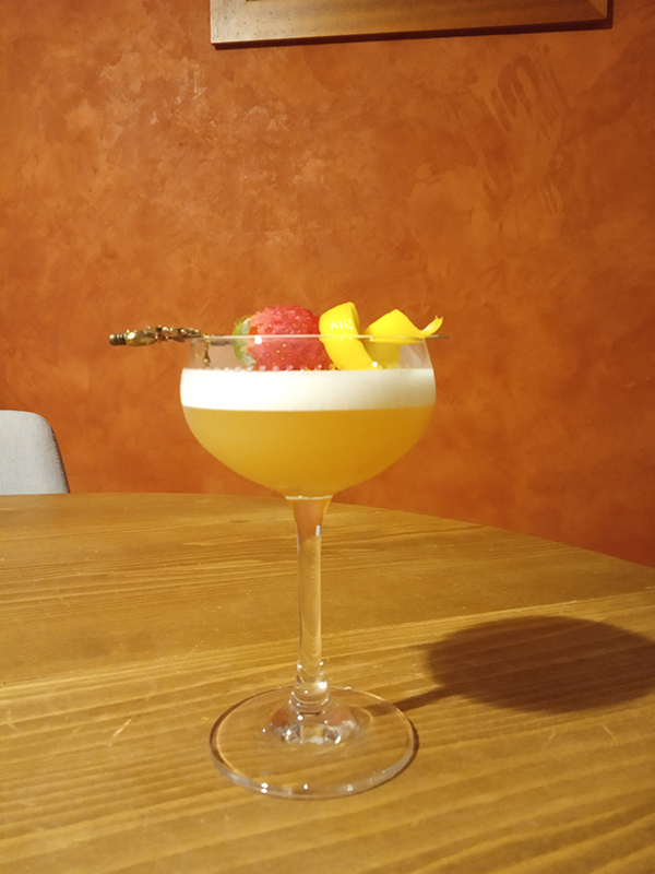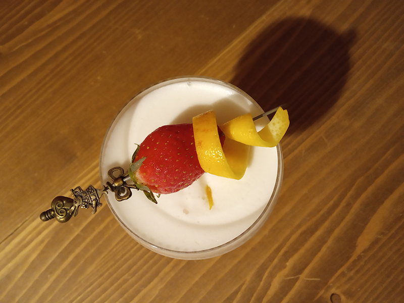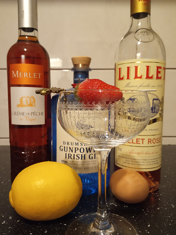 Variation on 1936 Sidney Cox's "Perfect Lady" recipe. 4 cl Gin – Drumshanbo Gunpowder1,5 cl Crème de Pêche Merlet1,5 cl Lemon0,75 cl Lillet Rosé1 eggwhite1 strawberry