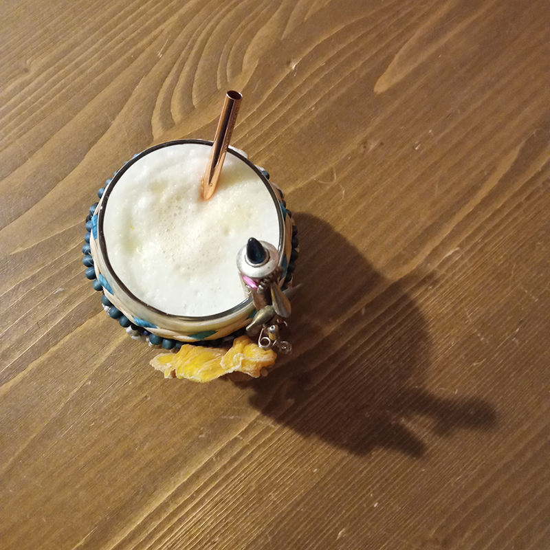 few drops of Honey Bitter Truth and dried jackfruit for garnish.