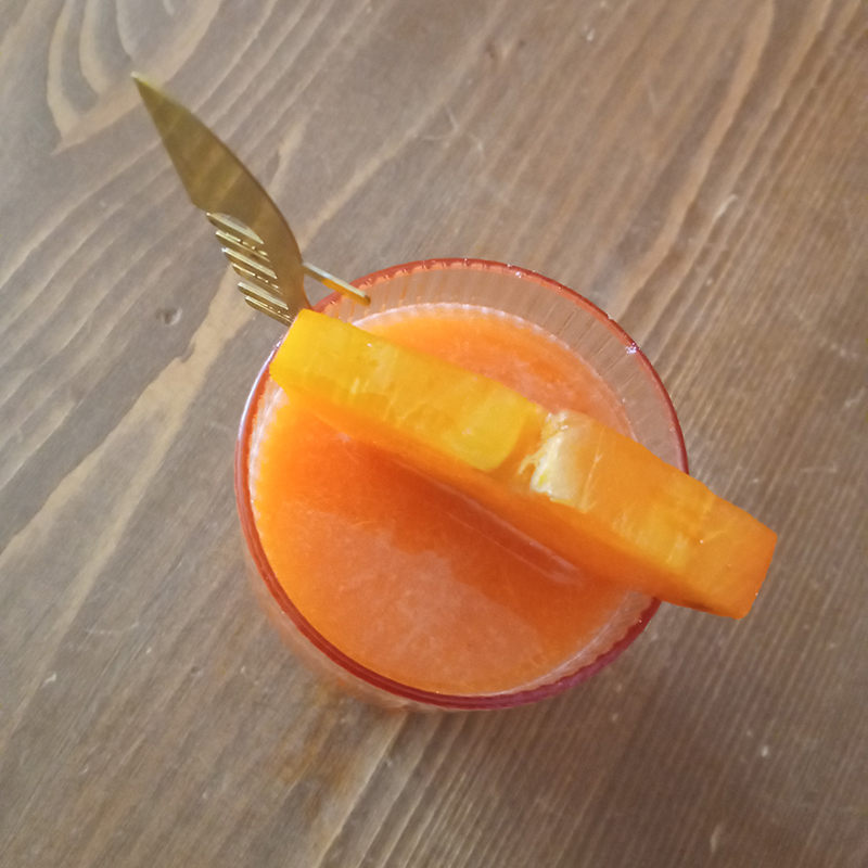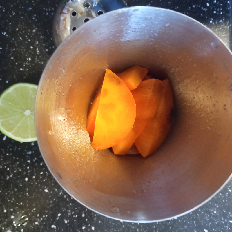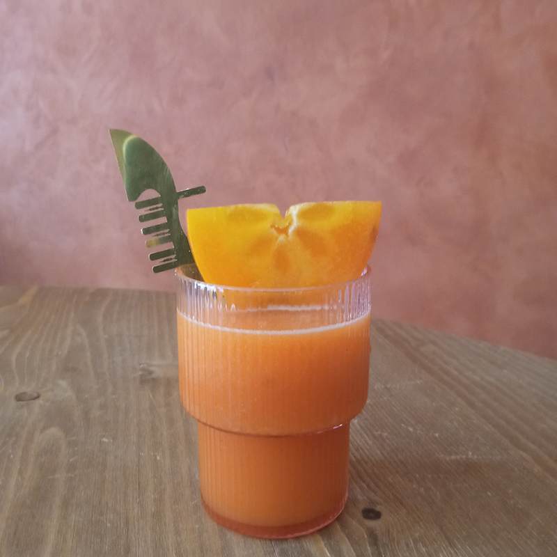 5 cl gin – Malfy Blood Orange1,5 cl Bitter Bianco – Luxardo1,5 cl Limecrushed persimmonTop up with carrot juice – Mariushalf slice of persimmon