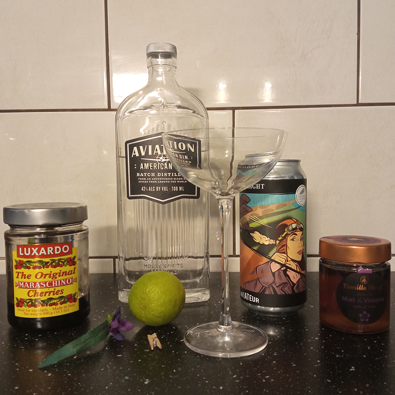 5 cl gin – Aviation2 cl lime1 dripping barspoon of Miel&Violette – Famille Marytop up with “First Flight” pale ale beer – Aviateur craft brewery