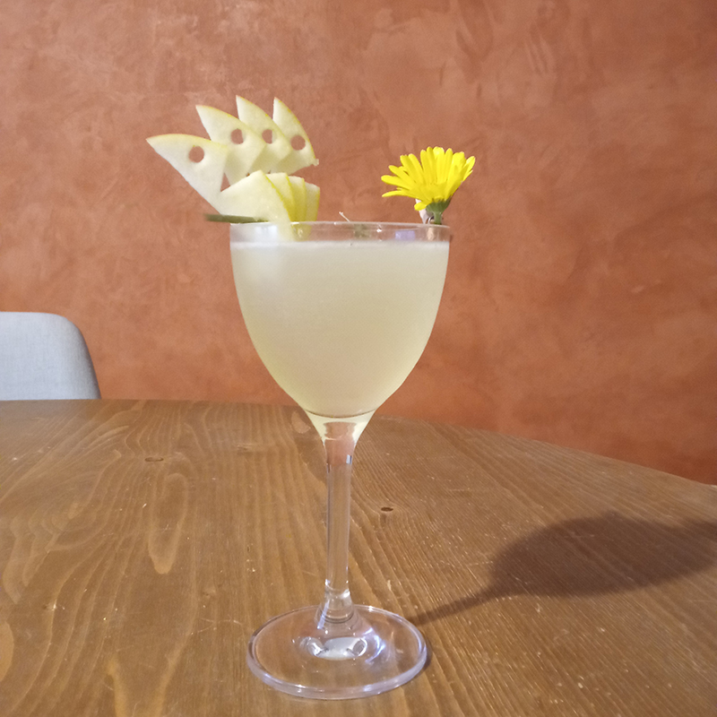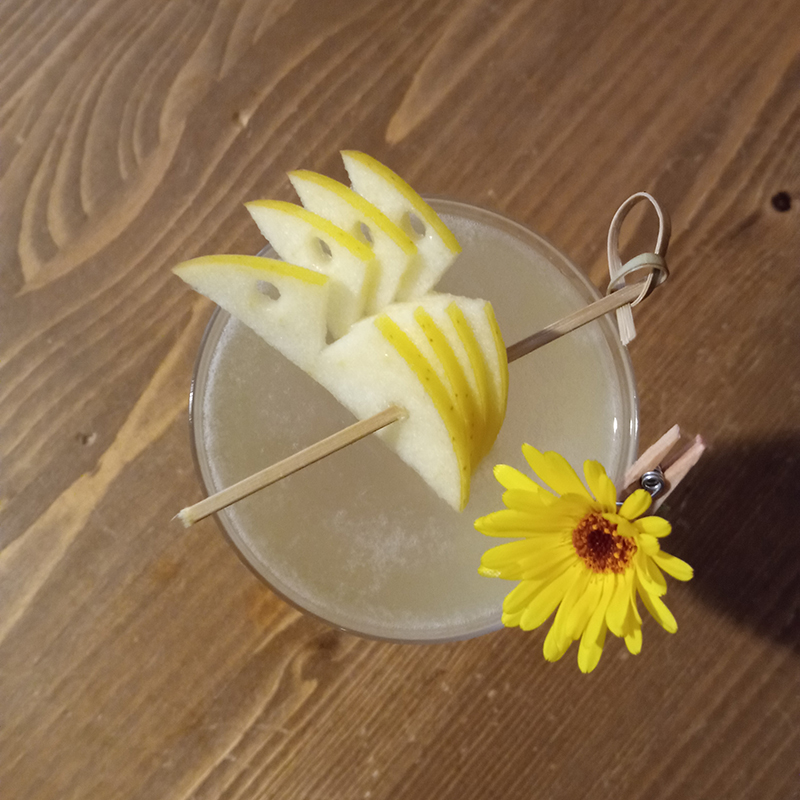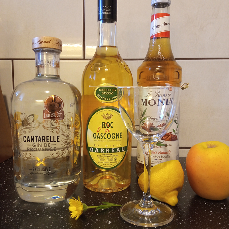 4 cl Gin – Cantarelle4 cl Floc de Gascogne blanc2 cl lemon1 cl Gingerbread syrup – Moningarnish : apple