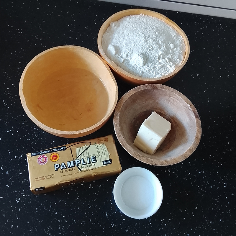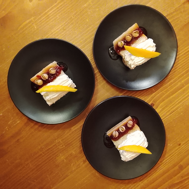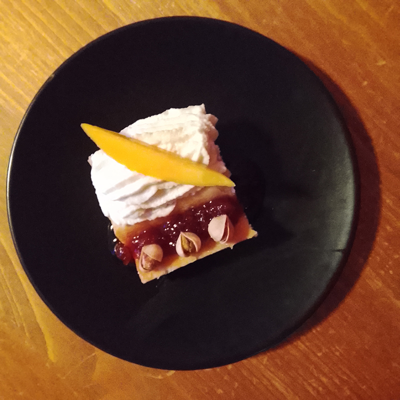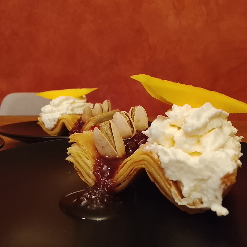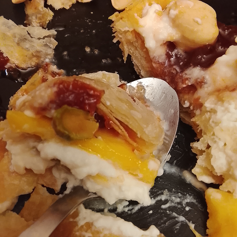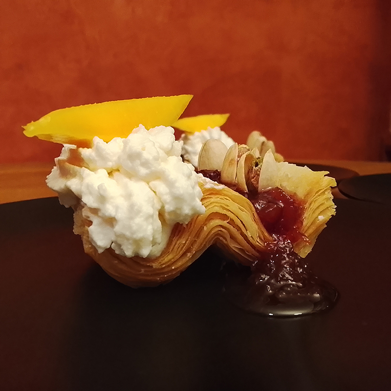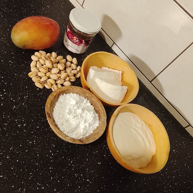 brousse/recuite et crème entière, sucre glace, farine, eau, beurre Pamplie, mangue, pistaches, confiture Papy Jam Cerises au thé Pu Erh Pivoine
