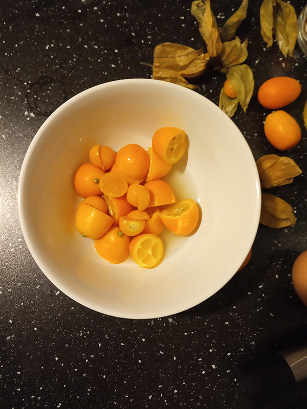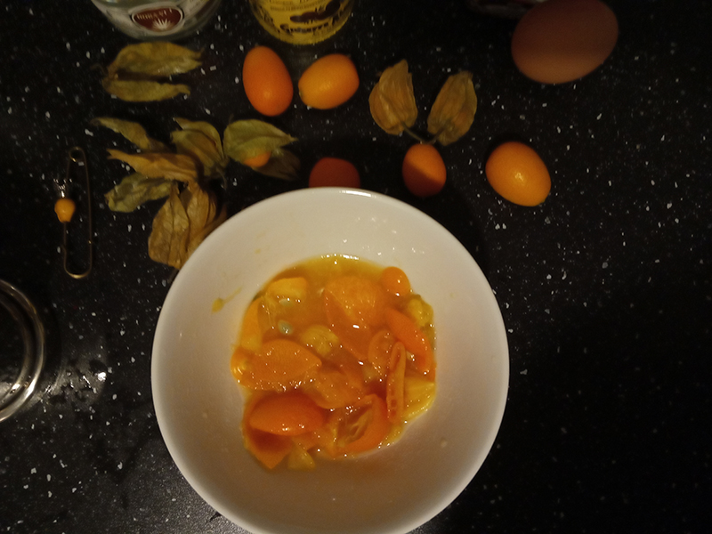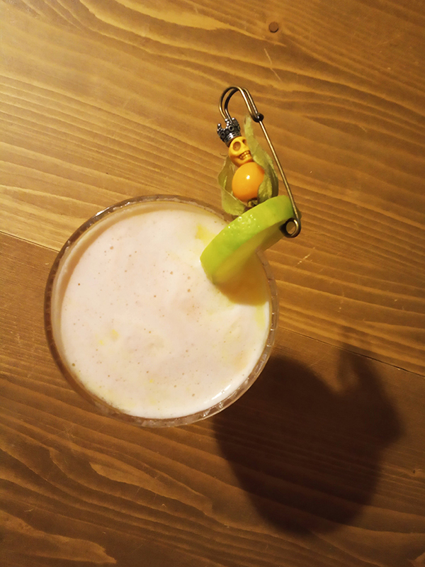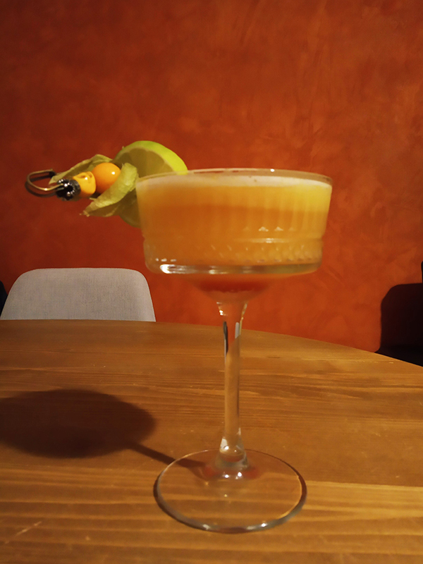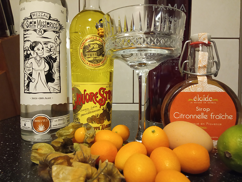 6 Kumquats5 Physalis2 cl Lime1,5 cl Syrop de Citronnelle by éloïde4 cl Mezcal – Siete Misterios Doba-Yej (Santiago Matatlán 2018)2 cl Stregasplash of Pama slightly dissipated at the bottom of the glass1,5 cl Eggwhite