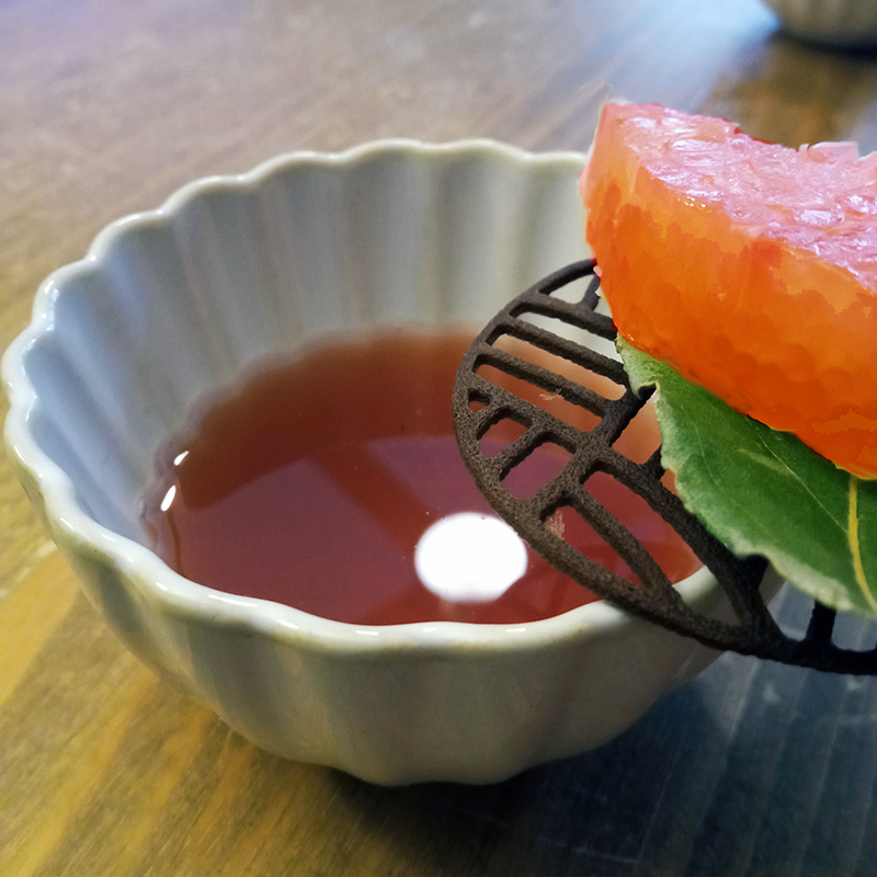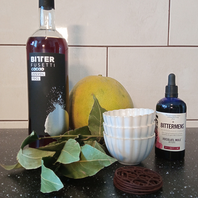 Bitter Fusetti CacaoXocolatl Mole Bitter – BittermensCitrus maxima – Sweet Pink Pomelo – Bưởi da xanhLaurel leavesbeurre d’Isigny, farine de châtaigne, sucre glace, oeuf