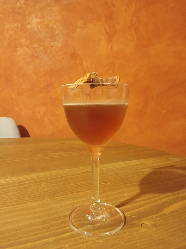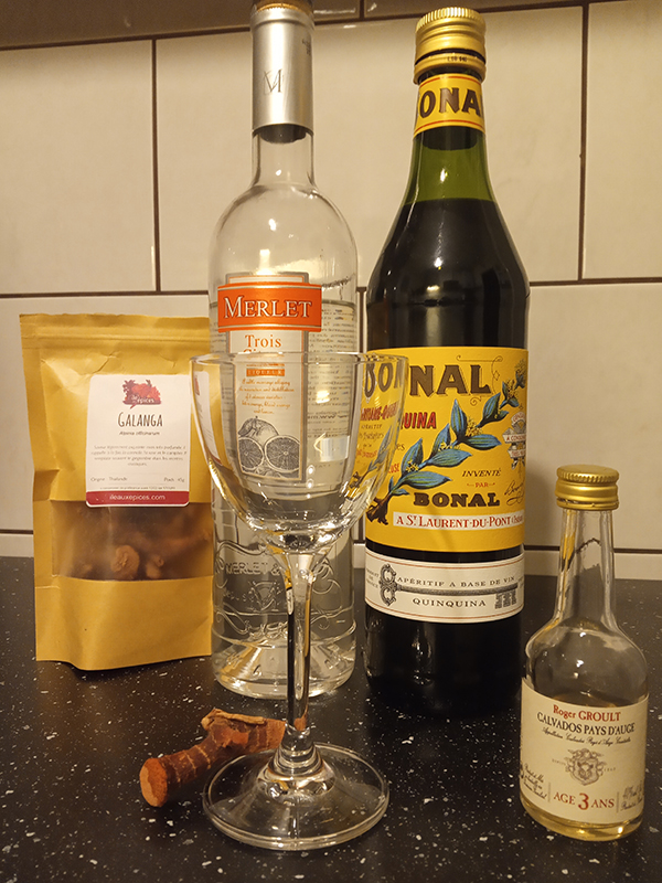 Stanislas Jouenne’s recipe. 2,5 cl Calvados – Roger Groult Pays d’Auge2,5 cl Triple Sec – Merlet Trois Citrus 2,5 cl Bonalgarnish with Galangal root