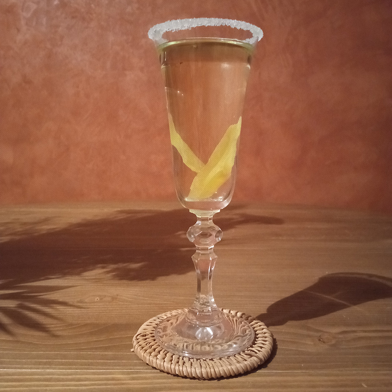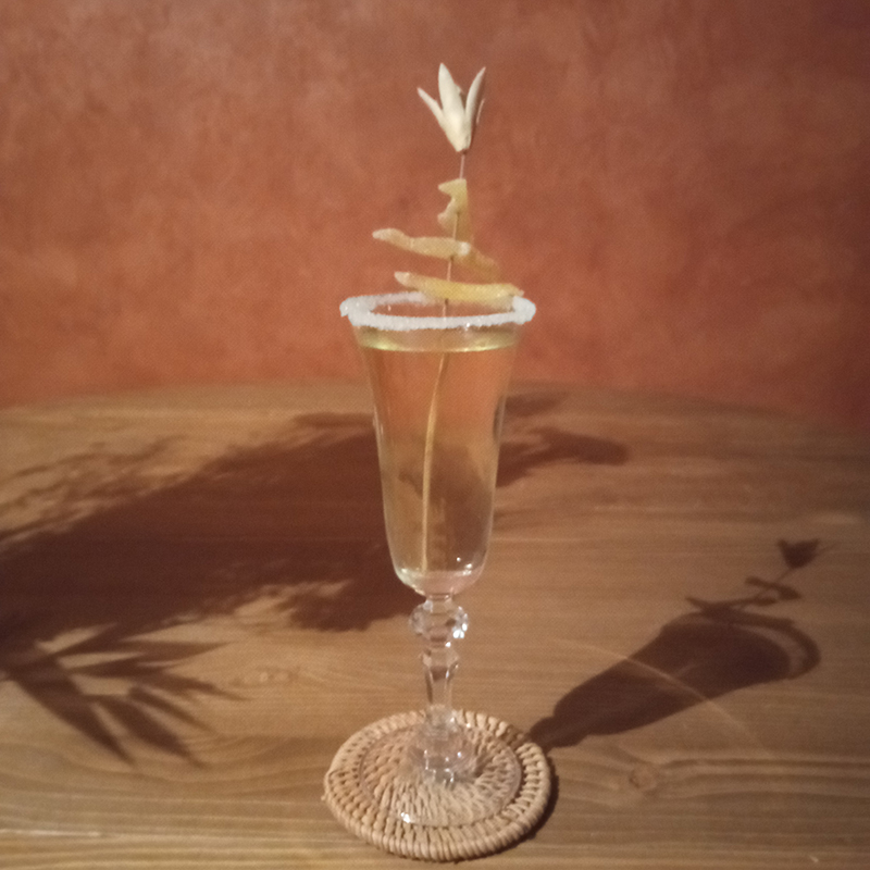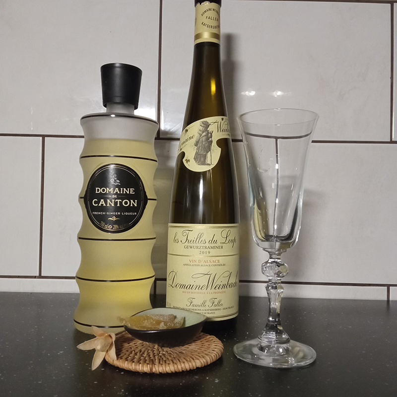 4 cl ginger liqueur – Domaine de CantonTop up with Gewürztraminer “Les Treilles du Loup” 2019 Catherine Fallerrim of glass with sugar and lemon + candied ginger garnish