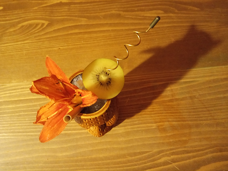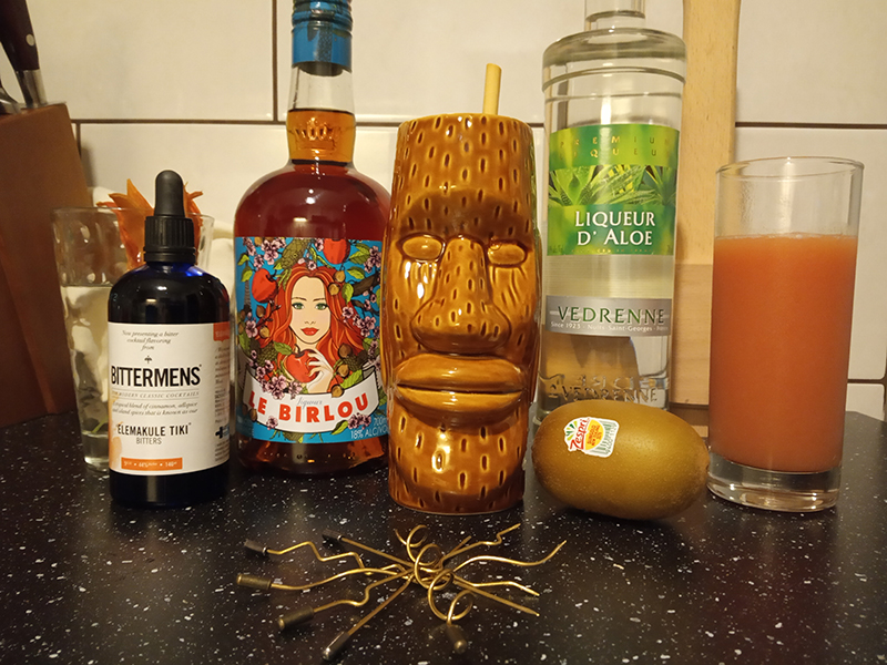 12 cl Guava Juice4 cl Birlou 1 cl Liqueur d’Aloe – Vedrenne2 dashes of Elemakule Tiki Bitter – Bittermenscrushed ice, and a Kiwi for Garnish