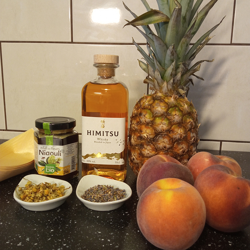 Himitsu Blended Whisky, white and yellow peaches, Niaouli honey, chamomile, lavender, pineapple.