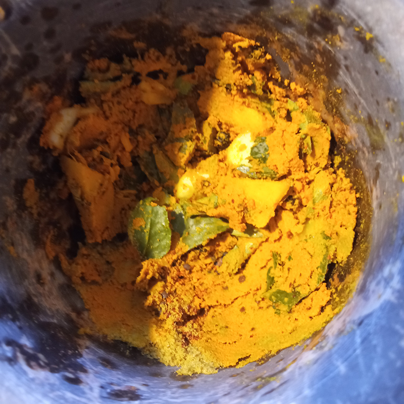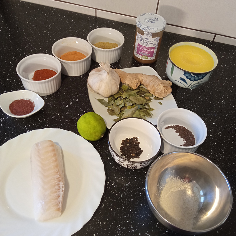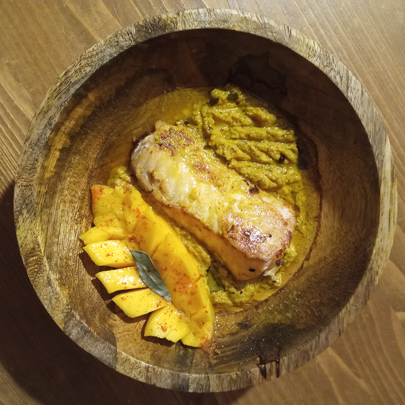 Dos de cabillaud sauce jamu … citron vert, miel de fleurs de coriandre, sumac, smoked paprika, cucurma, cumin, poivre noir de Kampot IGP, graines de moutarde, ghee, farine de riz, ail, gingembre, mangue.
