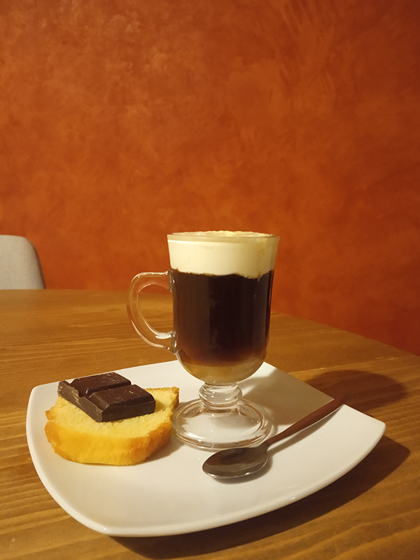 - 2 barspoons of brown sugar at the bottom of the glass, at the bottom of the glass mixed with coffee and whiskey before adding the cream