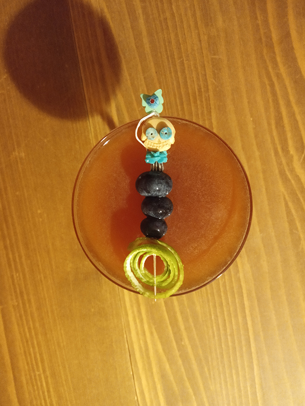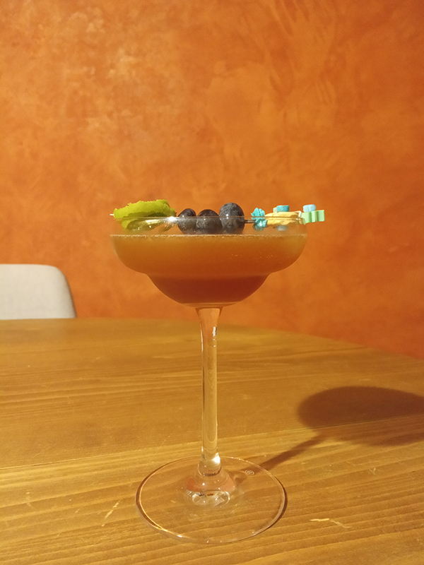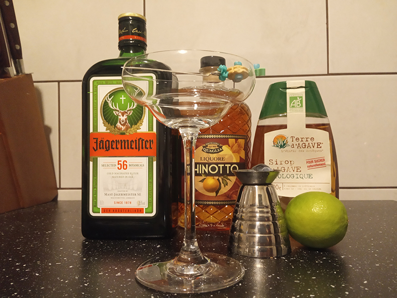 Recipe by David Cordoba. With Chinotto instead of Cointreau. 4,5 cl Jägermeister 2,25 cl Quaglia Chinotto 2,25 cl Lime1 barspoon of Agave Syrup some blueberries for garnish