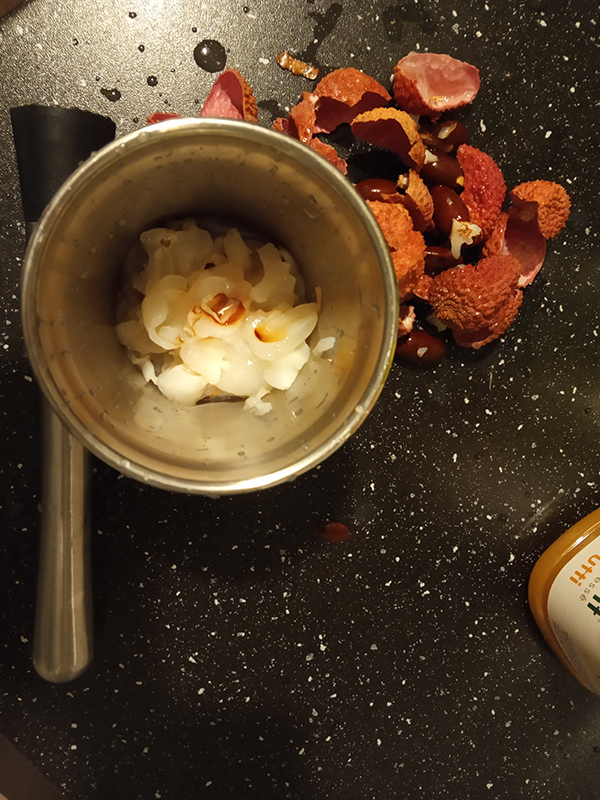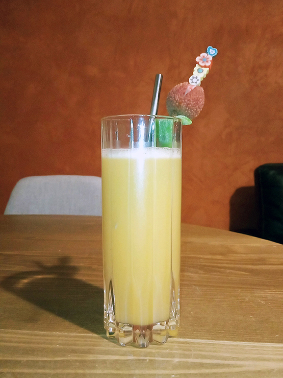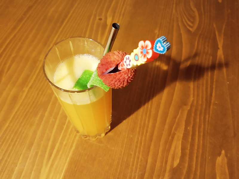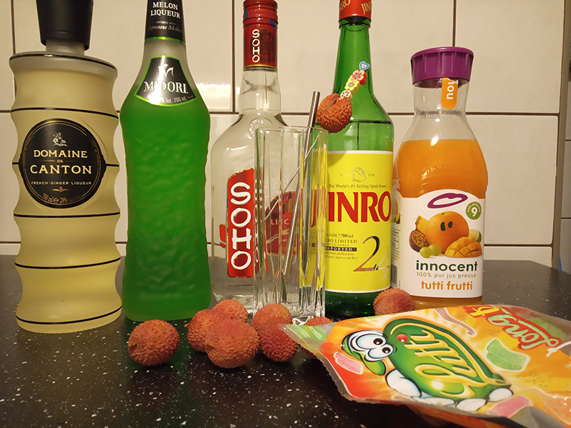 4 cl Jinro 241,5 cl Canton1 cl Midori1,5 cl Soho12 cl Tutti Frutti Innocentseveral crushed lycheesLutti Long Fizz