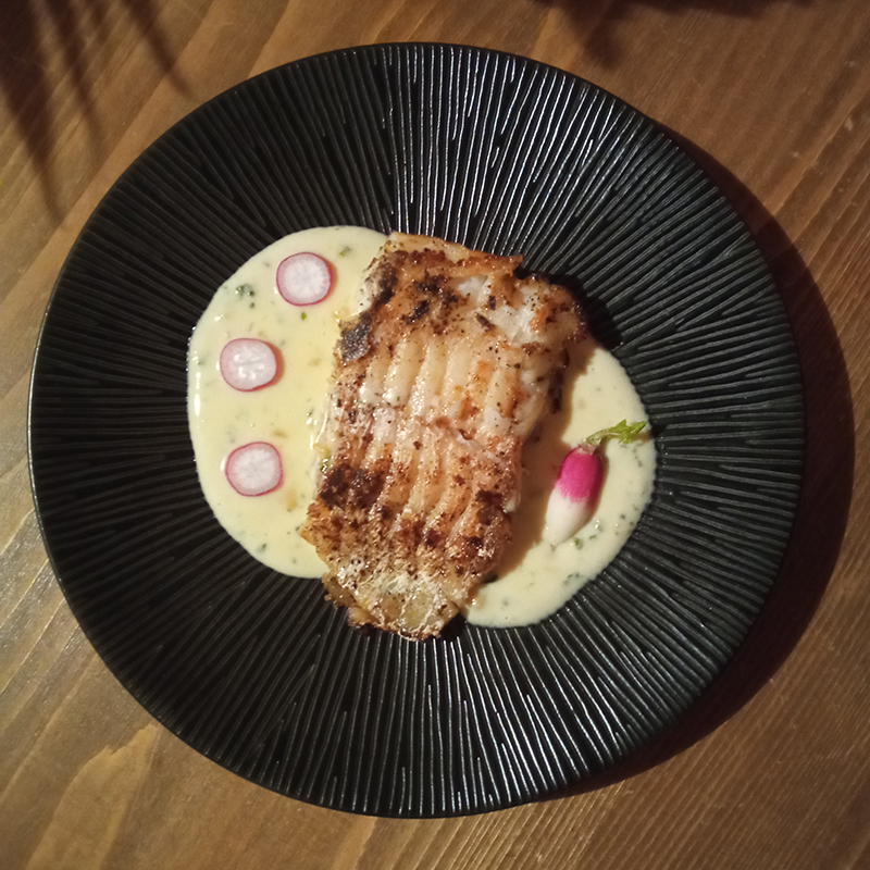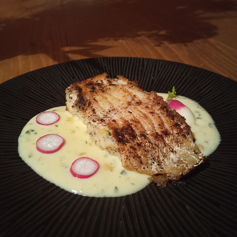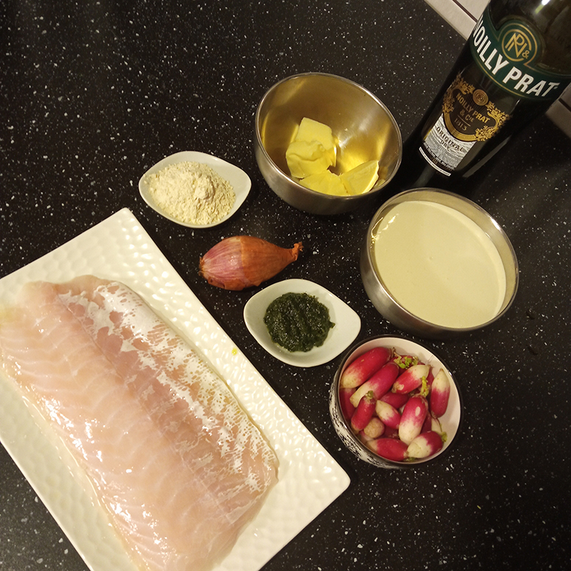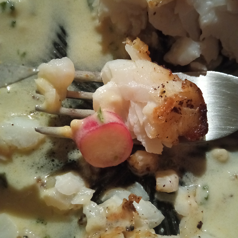 Blue ling, shallot, horseradish (raifort), wild garlic (ail des ours), cream, butter, pink radish, Noilly Prat