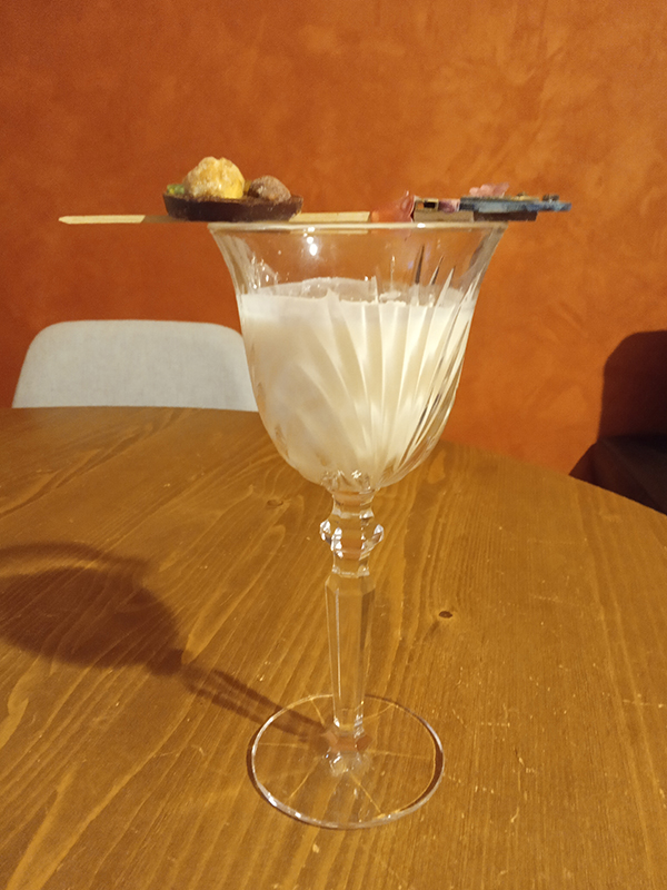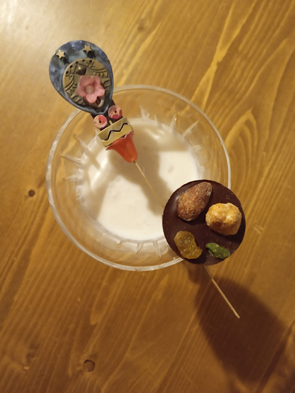 - garnish with a “Mendiant” ( almond, pistachio, hazelnut and raisin on a dark chocolate disc )
