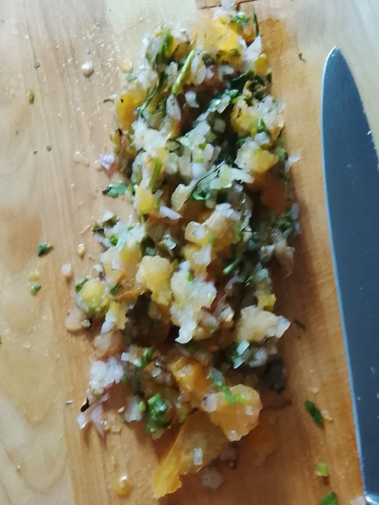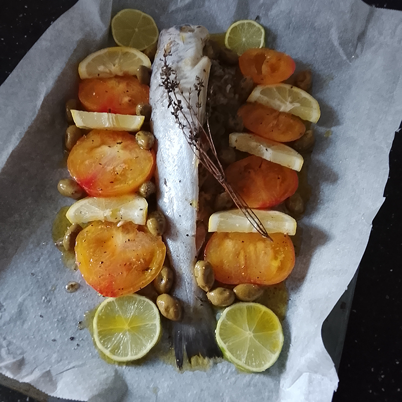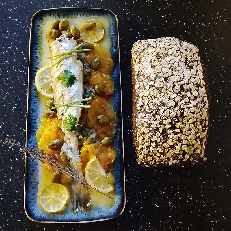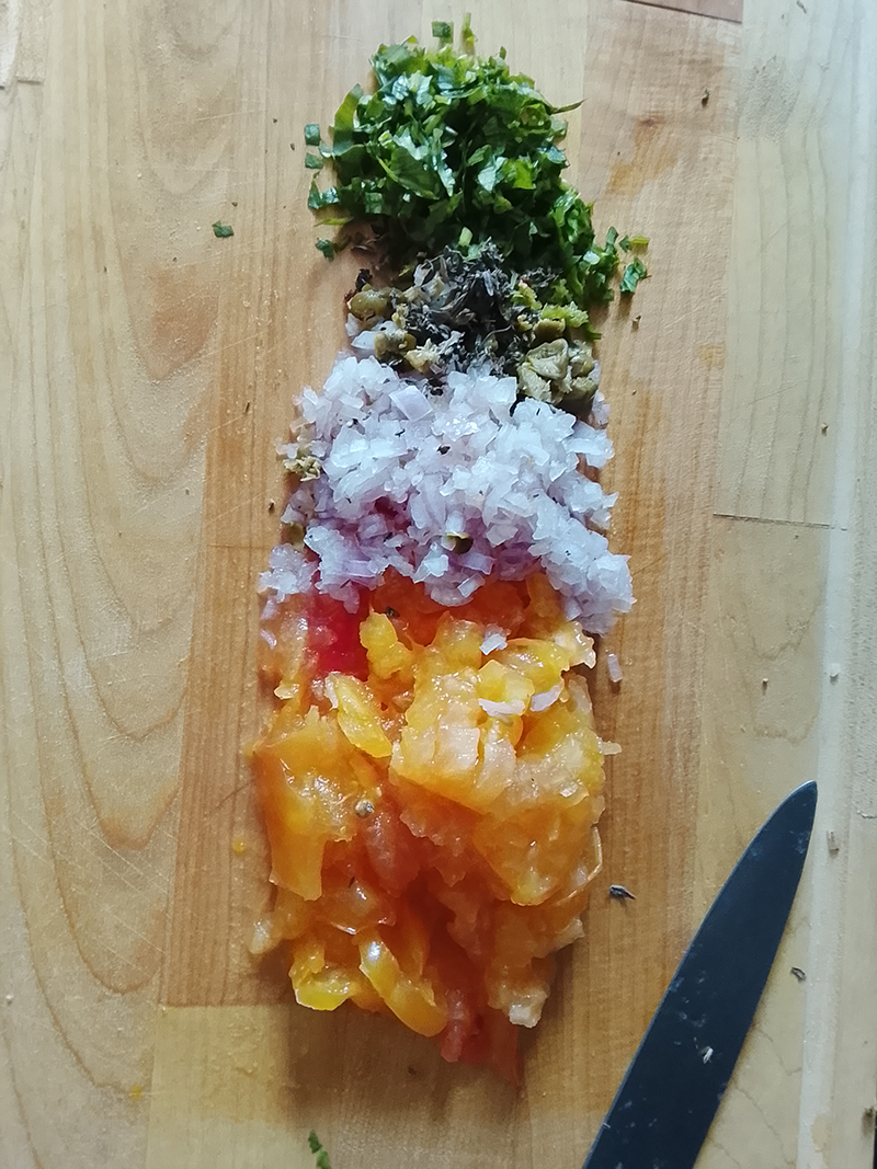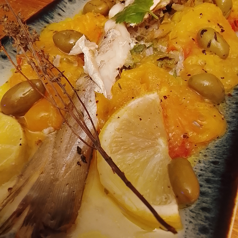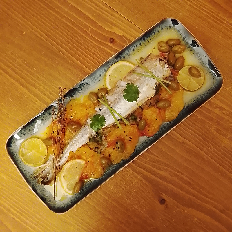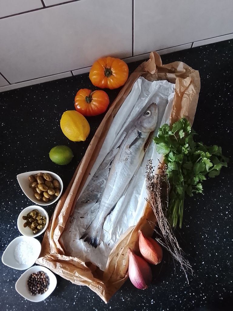 Merlan, tomates jaunes, citrons, câpres, olives, thym, persil, échalotes