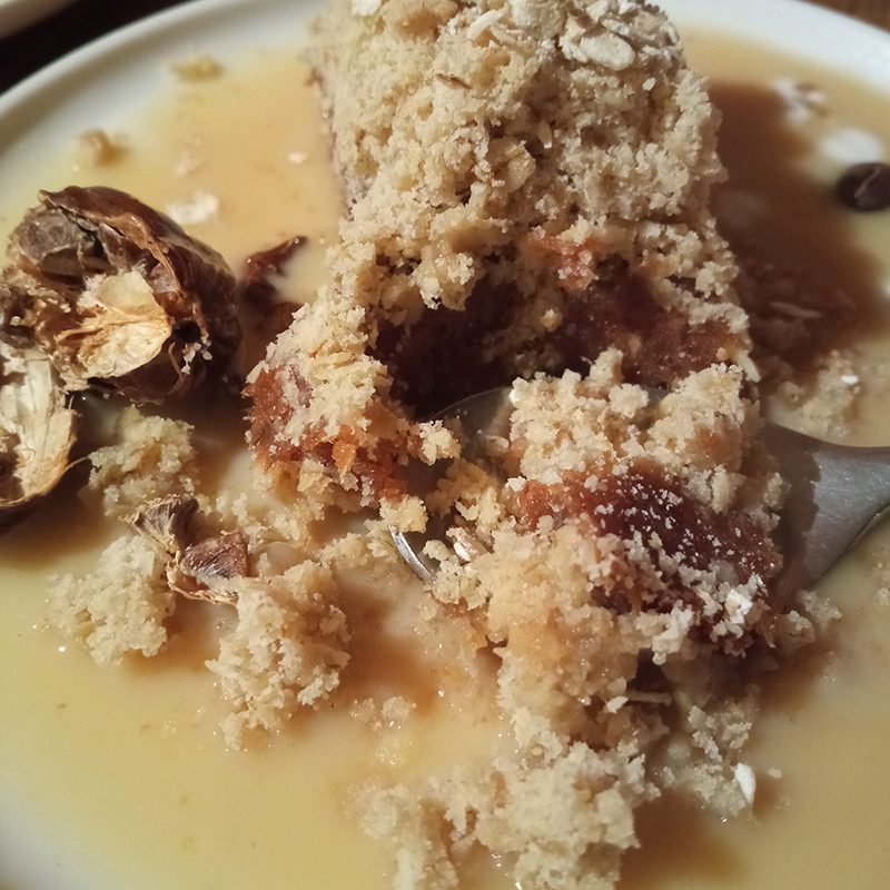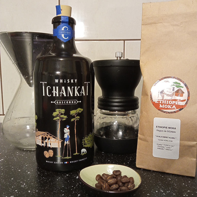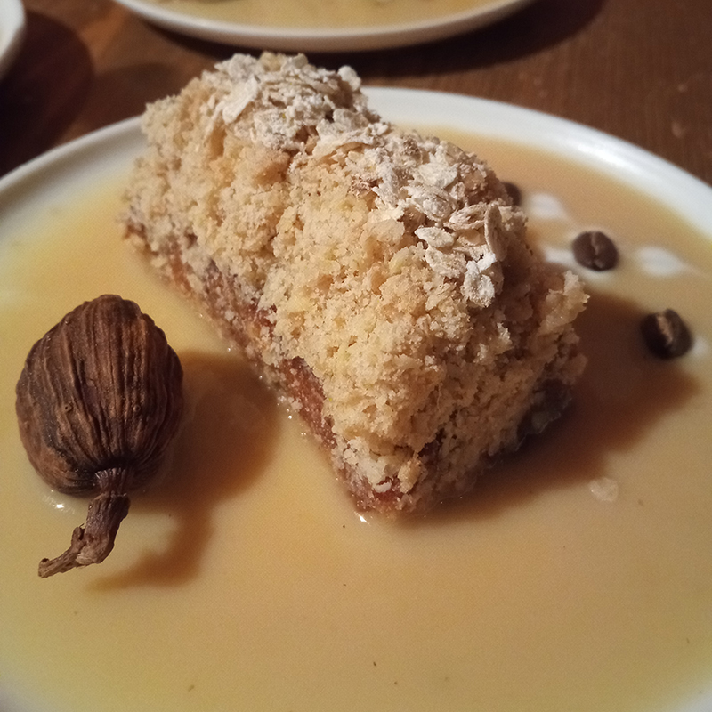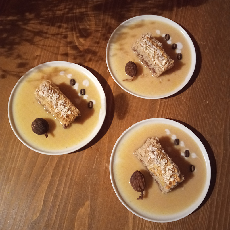 Whisky Tchankat Gasconha, Moka ethiopian coffee Sidaman, black cardamom, date paste, butter, brown sugar, oat flakes, wheat flour, coconut cream, Valrhona 35% Ivory white pastry chocolate