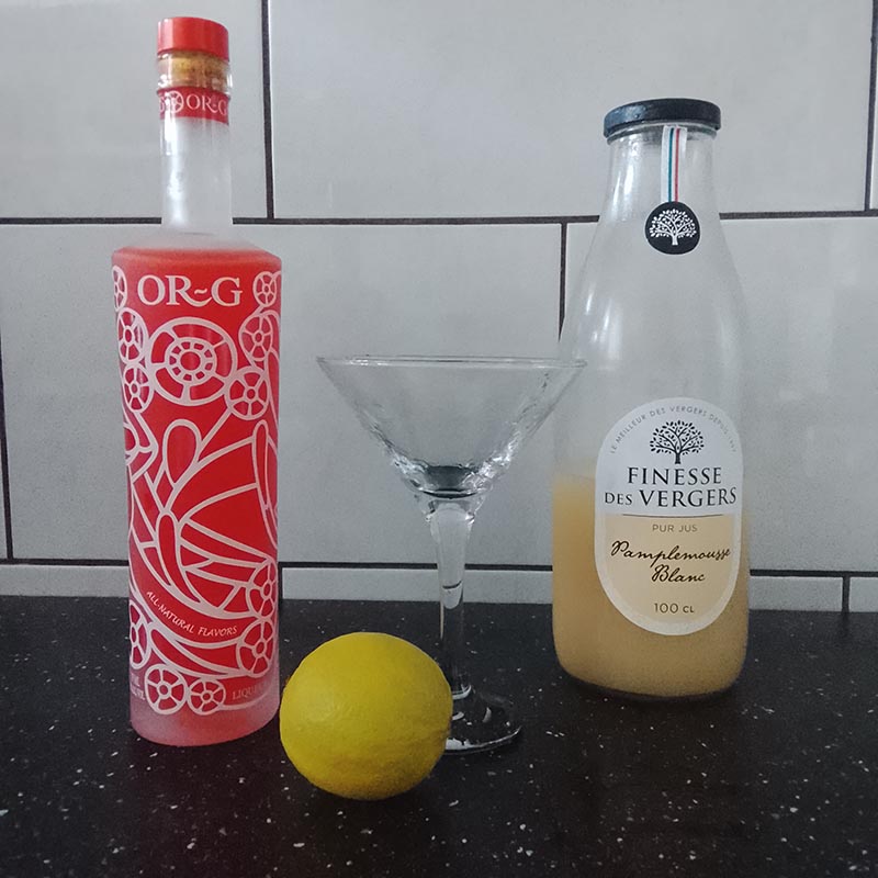 4 cl liqueur Or-g (Kaki, Papaye, Mangue et Citron Vert)8 cl jus de pamplemousse blanc – Finesse des Vergers2 cl lime