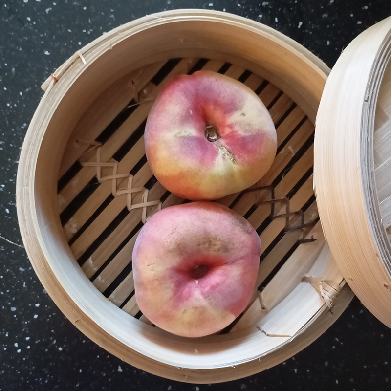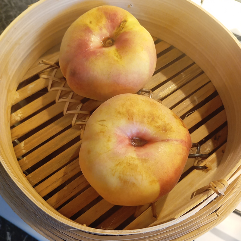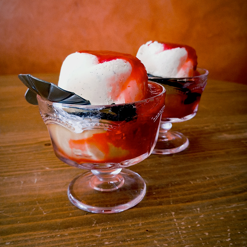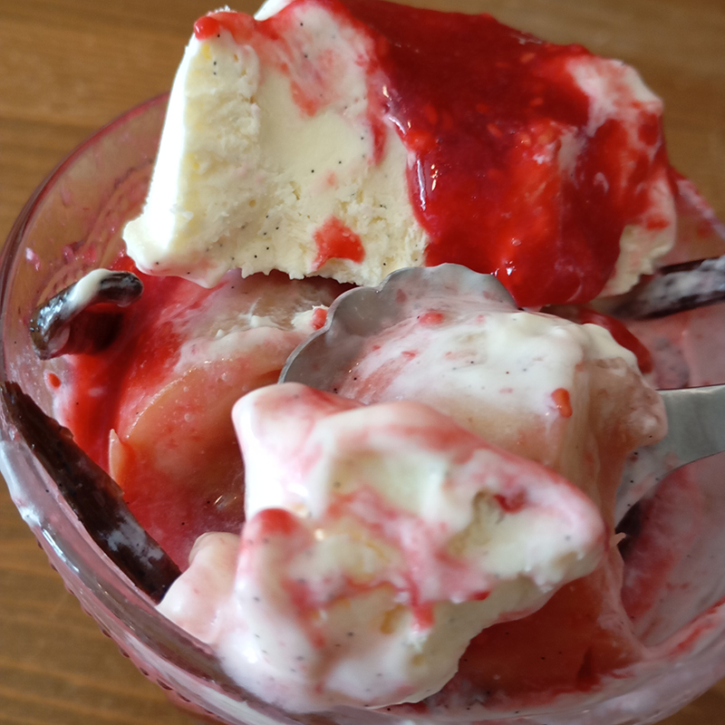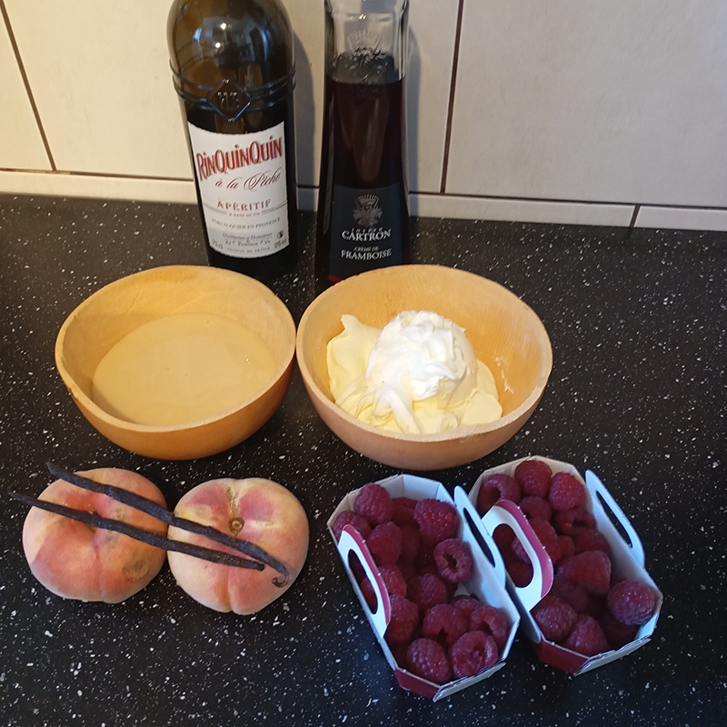 variation on a classic : Rinquinquin steamed flat peaches, raspberry coulis with Cartron raspberry cream, homemade vanilla ice cream (sweetened condensed milk + Isigny cream + vanilla pods)