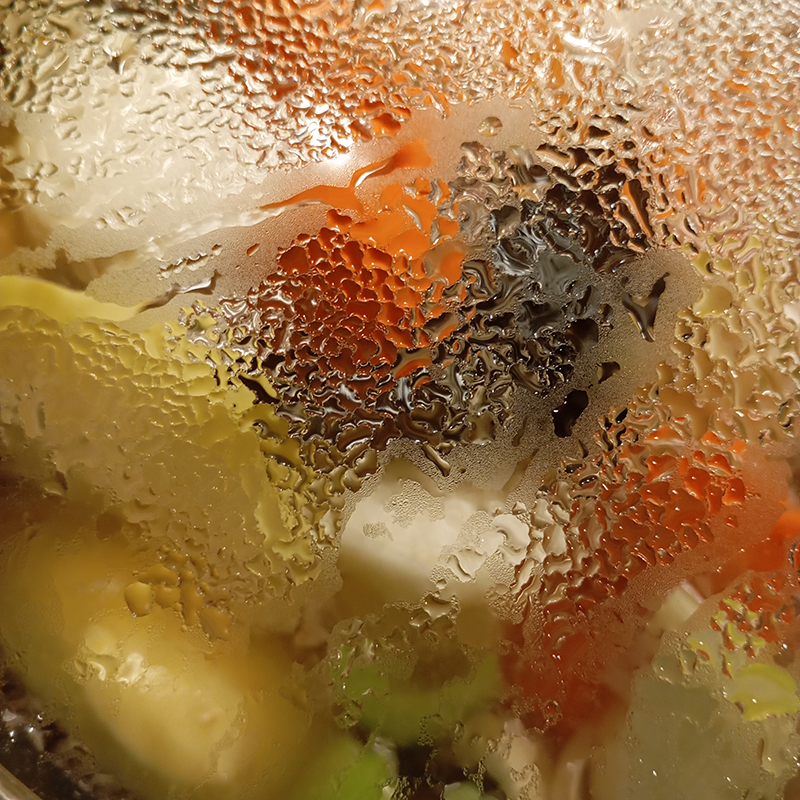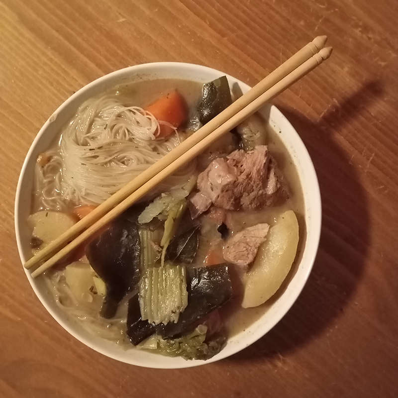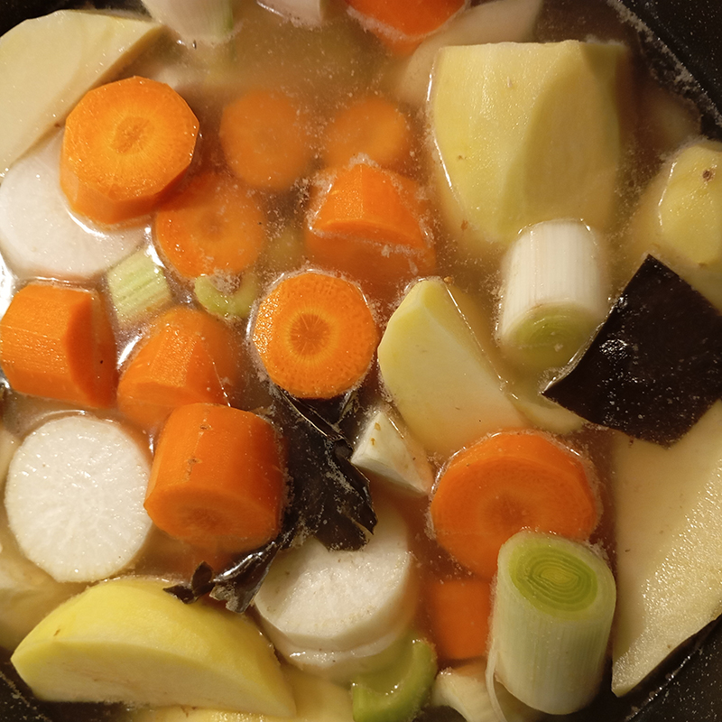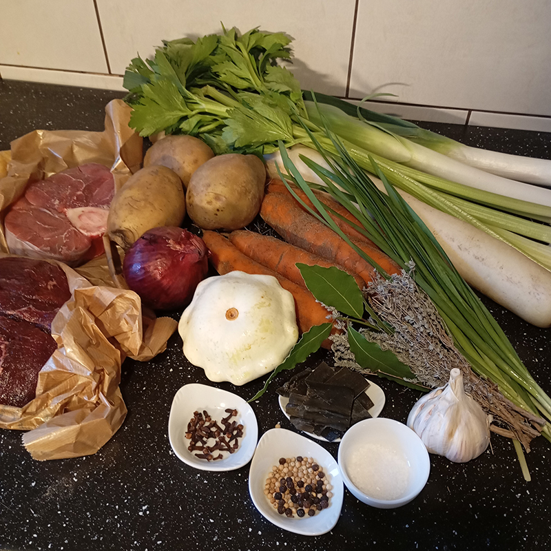 Bún Tươi, algue Kombu, ciboules Nira, ail, clou de girofle, thym, laurier, jarret de veau, joue de bœuf, pâtisson, navet long, oignon, poireau, carotte, pomme de terre, céleri…