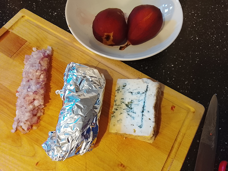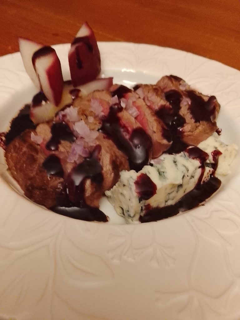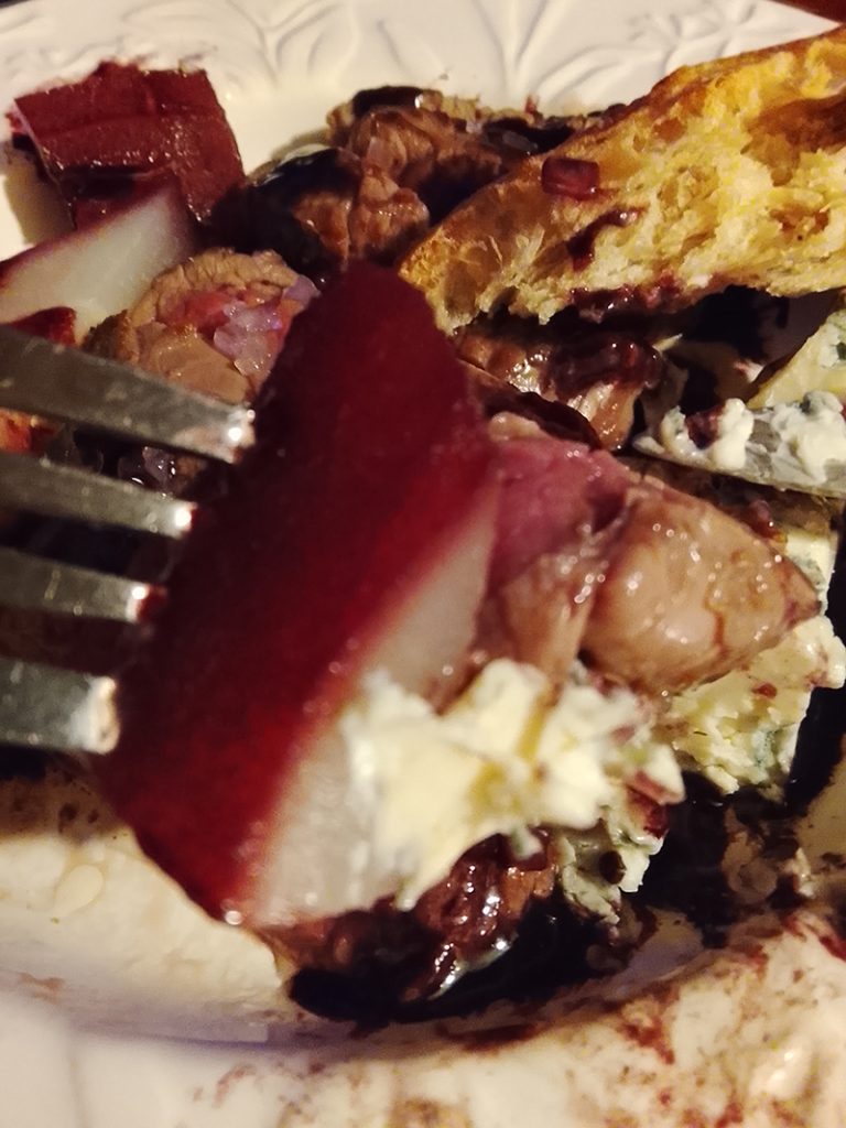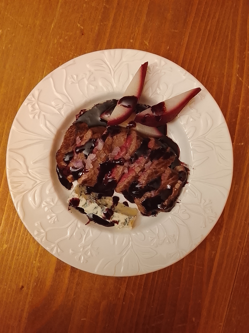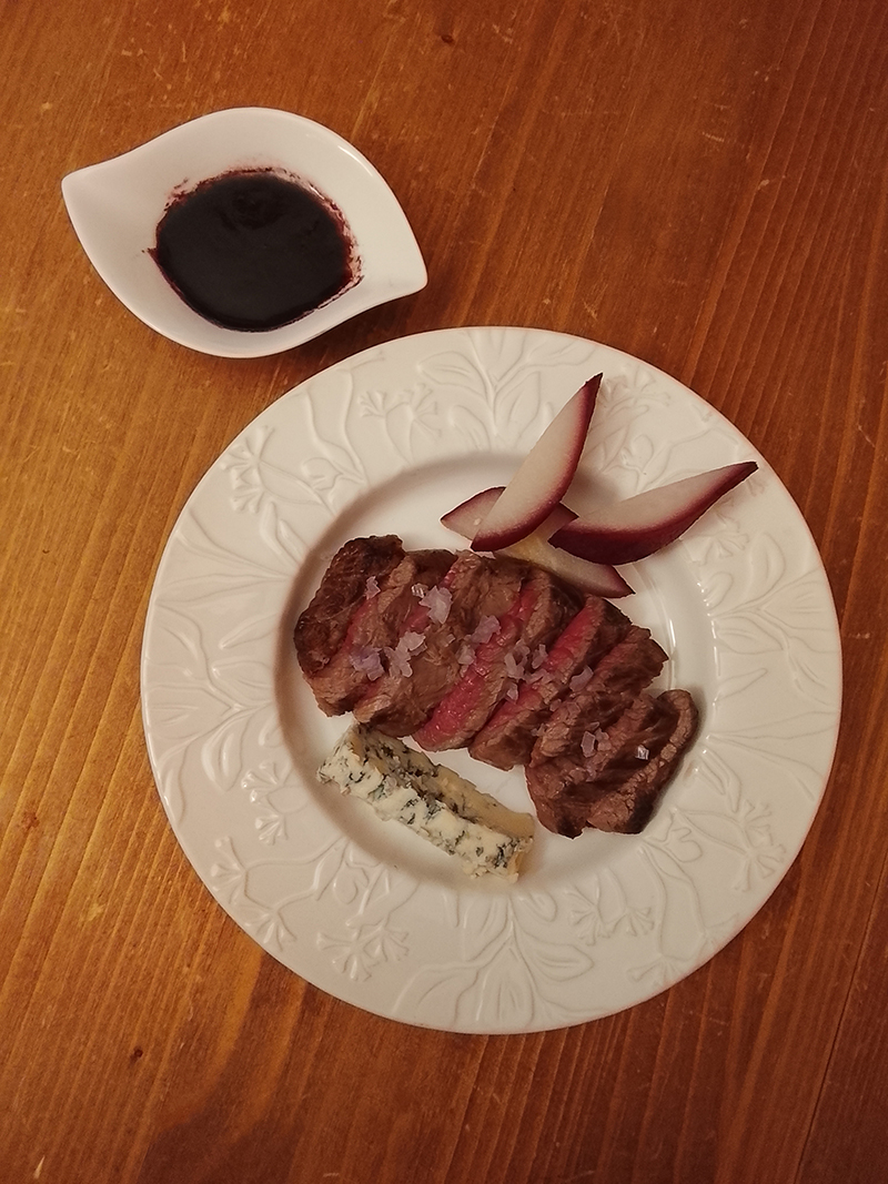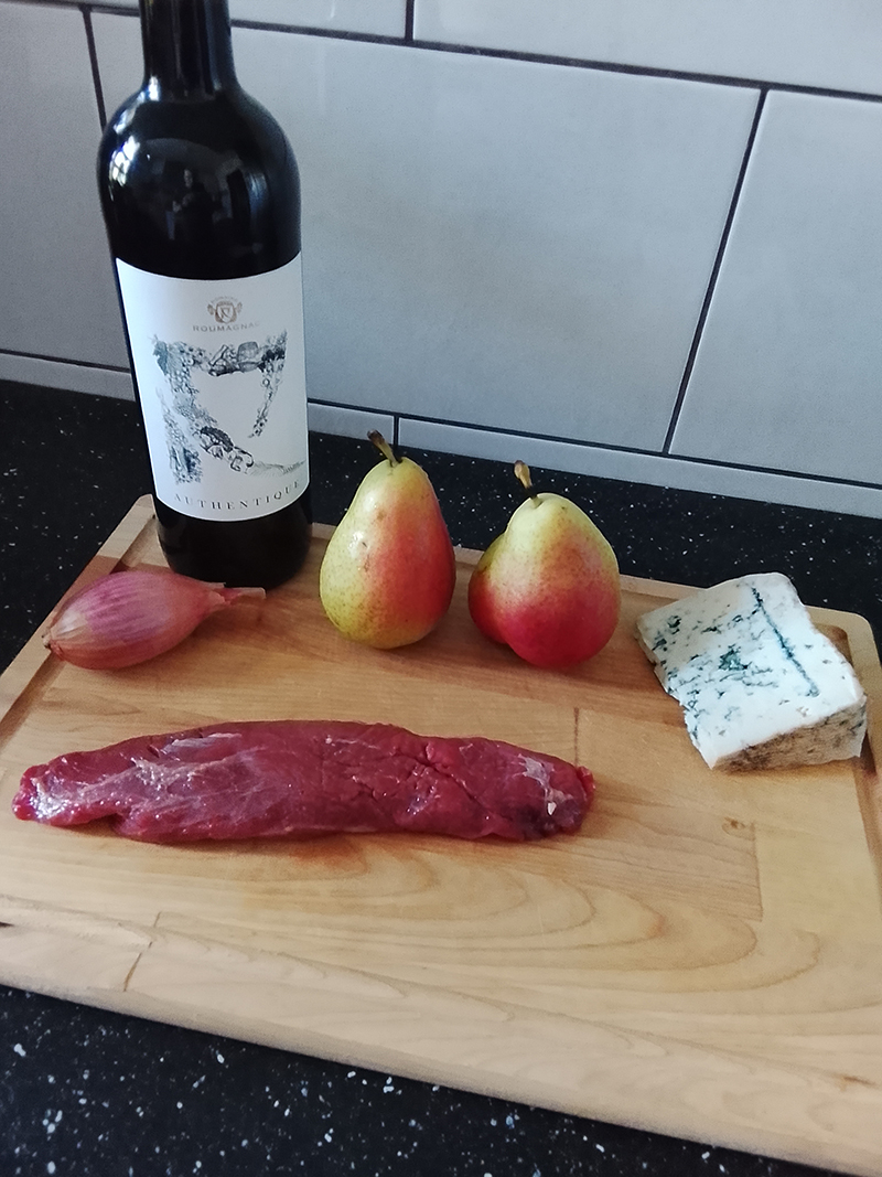 Poire de boeuf, échalote, Roquefort AOP Baragnaudes, Poires Williams, Vin rouge Domaine Roumagnac “Authentique”