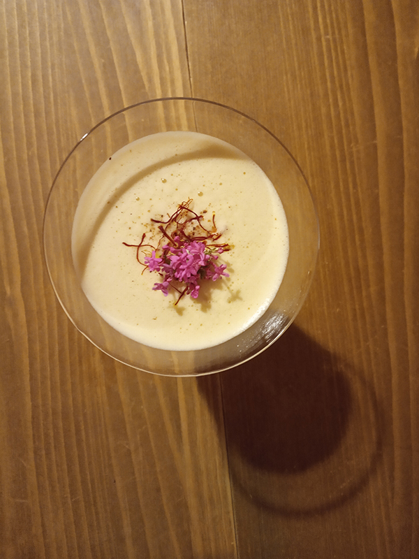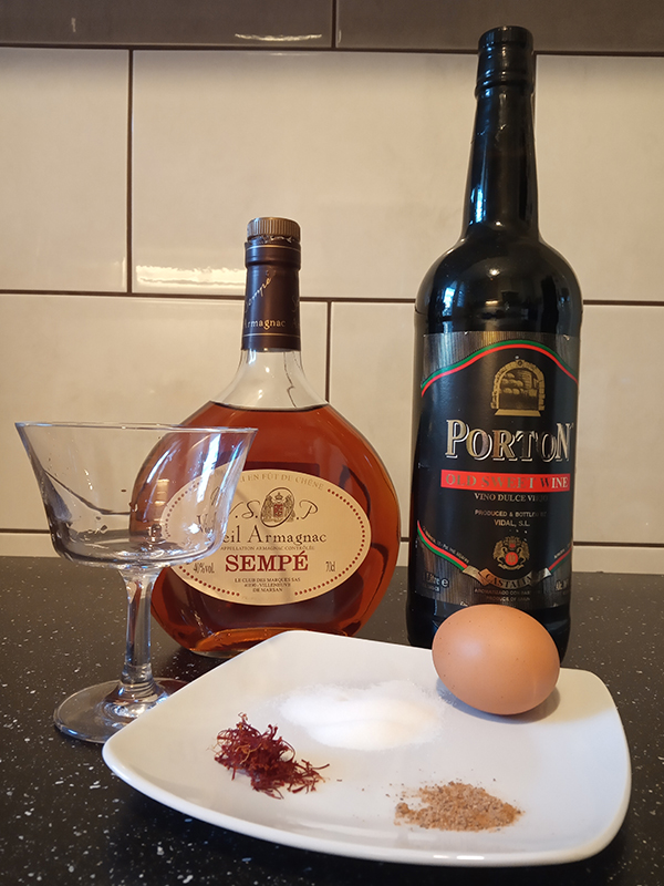 4 cl Porto – Bodegas y Destilerías Vidal2 cl Armagnac – VSOP Sempé1 barspoon fine white sugar + 1 egg yolknutmeg + saffron