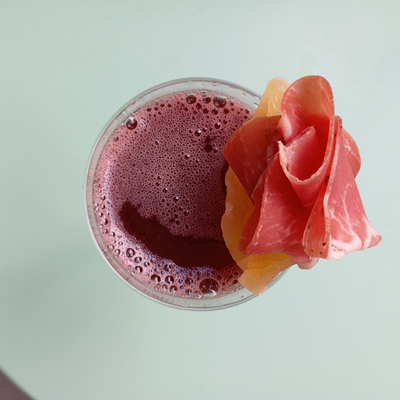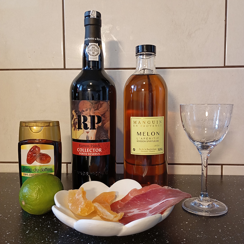 4 cl Porto Ramos Pinto Collector Reserva Rouge2 cl Liqueur Melon – Manguin1,5 cl lime1 cl sirop de dattesmelon déshydraté et jambon cru d’Ariège