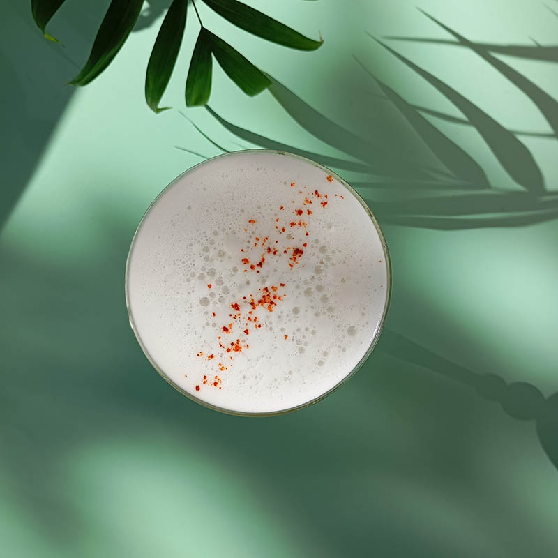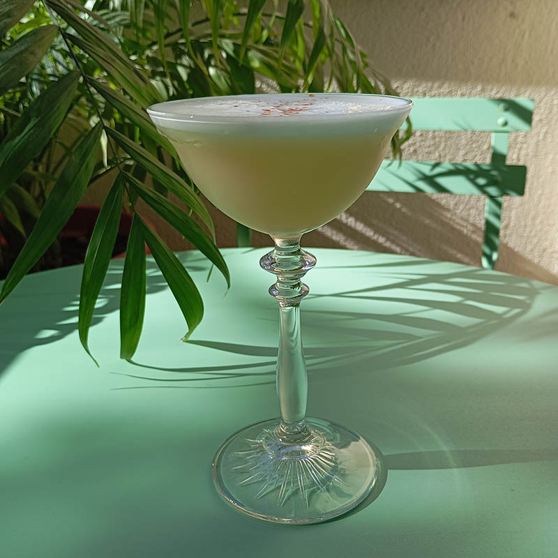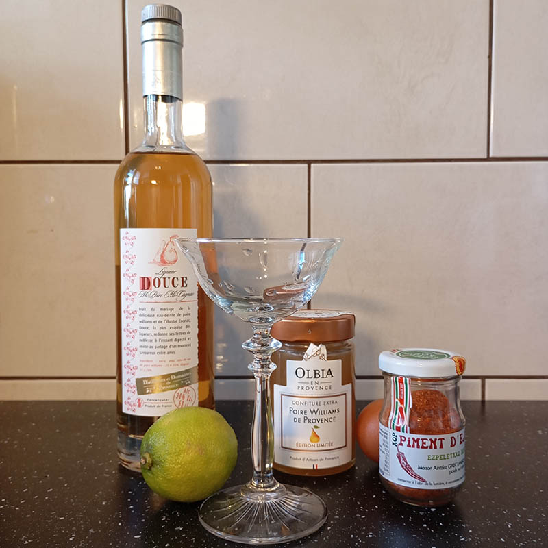 5 cl liqueur Douce mi poire mi Cognac1 generous barspoon of confiture Poire Williams de Provence – Olbia2 cl limepiment d’Espeletteeggwhite