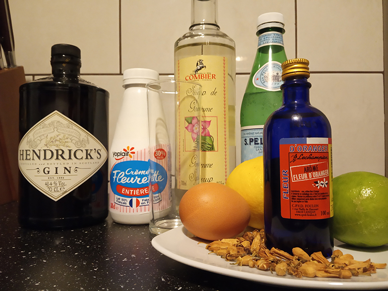 6 cl Gin – Hendricks6 cl cream – Crème Fleurette Yoplait3 cl Gum syrup Combier 1,5 cl Lime1,5 cl Lemon1 eggwhitea dash of soda water – San Pellegrino 2 dashes of Fleur d’oranger + Aurantium-Bigaradier dried flower