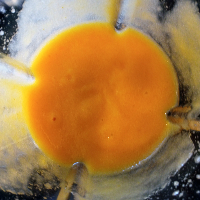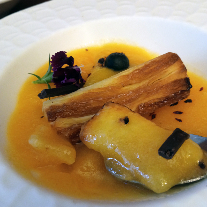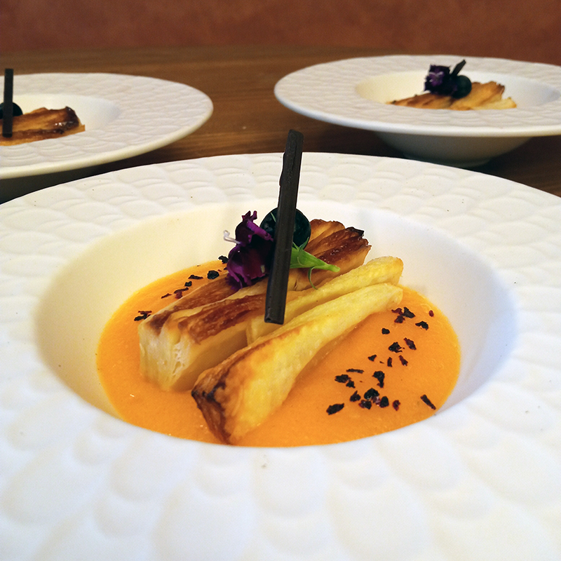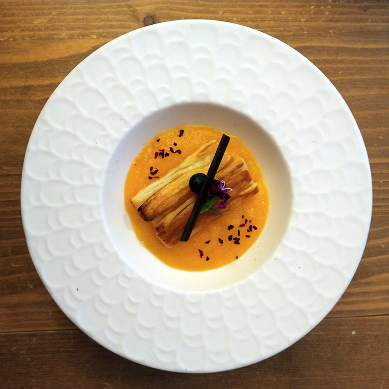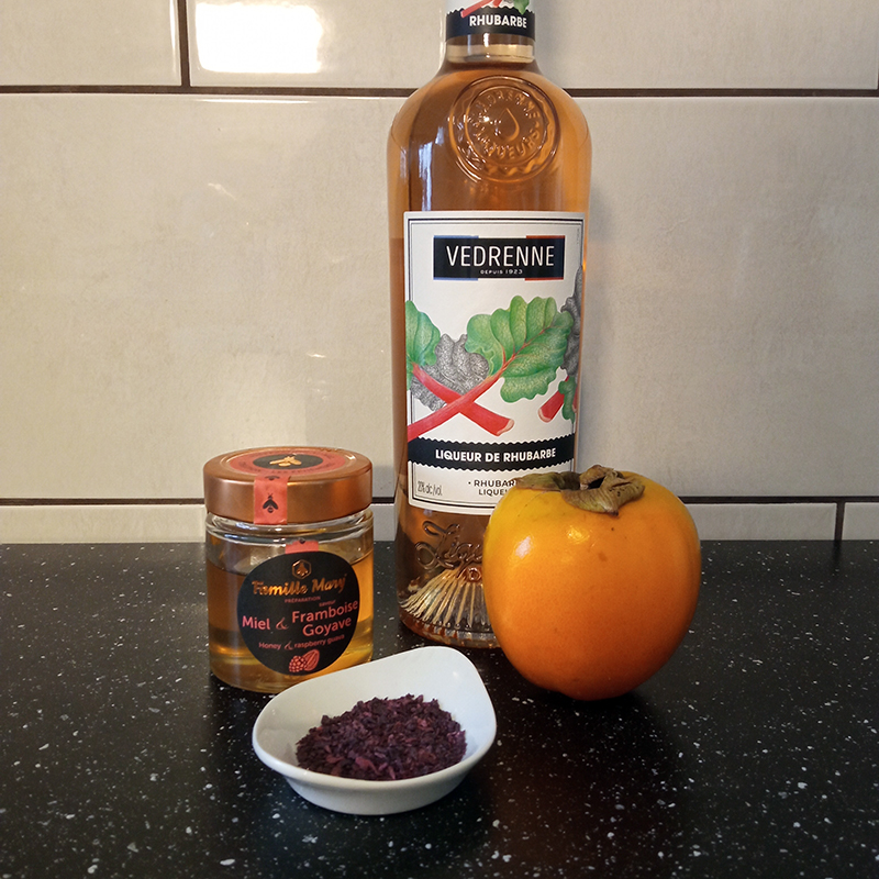 Liqueur de rhubarbe – Vedrenne, kaki, flocons de shiso séché, miel framboise goyave – Famille Mary, pâte feuilletée (garniture : chocolat noir Valrhona, myrtille, oeillet – fleur comestible)