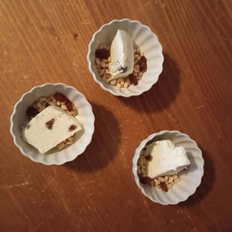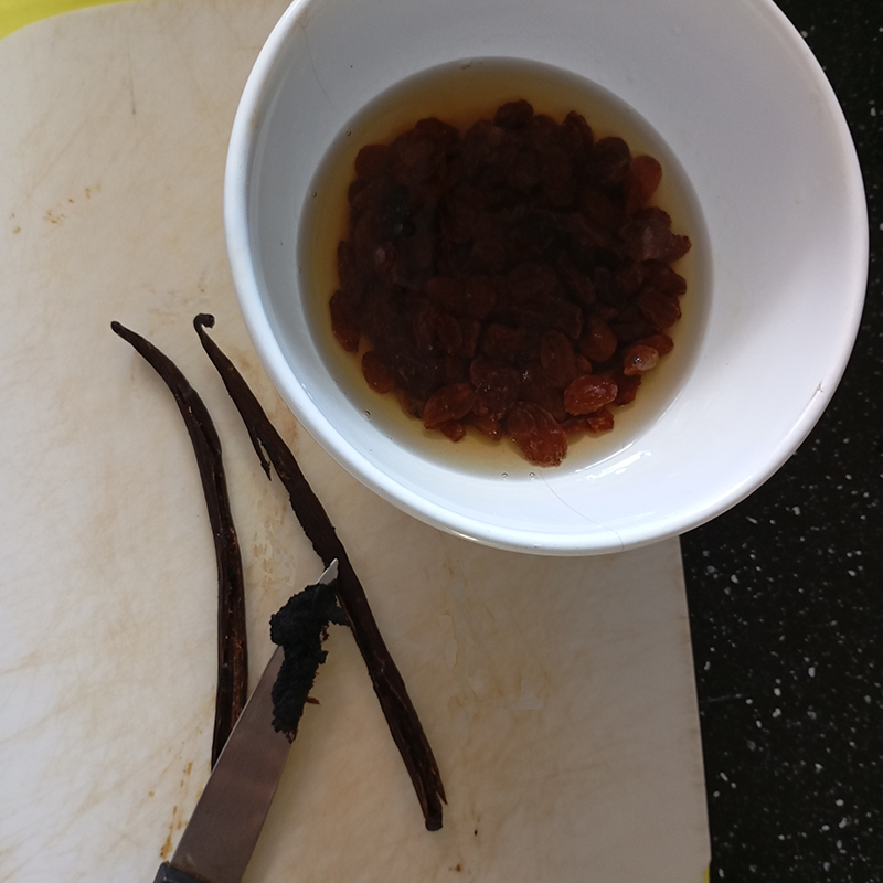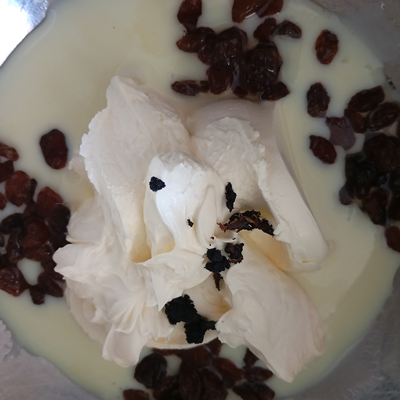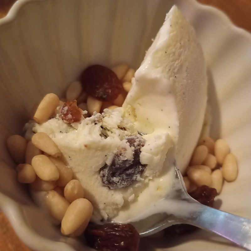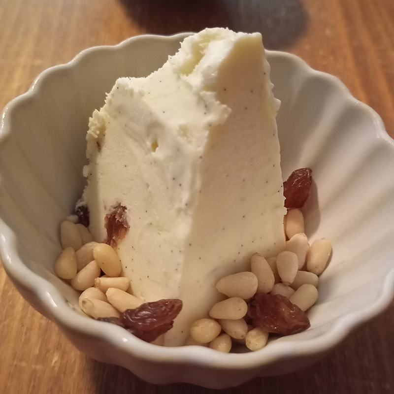 glace (lait concentré sucré, crème d’Isigny, gousses de vanille, raisins secs, pignons de pin, rhum Charrette Héritage Vanille
