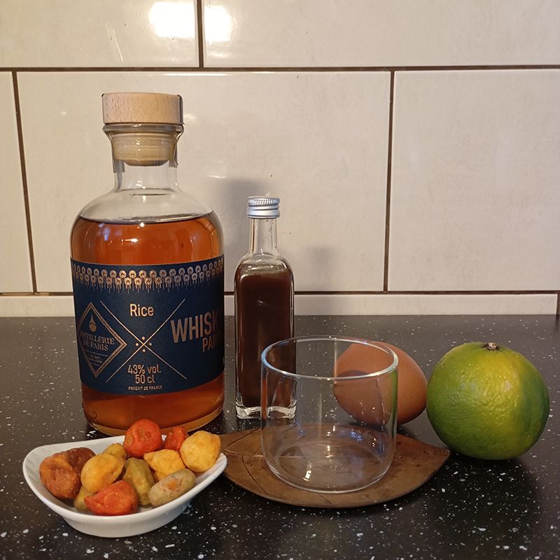 4 cl Rice Whisky – Distillerie de Paris2 cl lime1,5 cl homemade syrup (black sugar Amami Oshima, tea Genmaicha Yama, Midori, Oolong “Sticky Rice” Nuo Mi Xiang)eggwhitegarnish : arachides wasabi