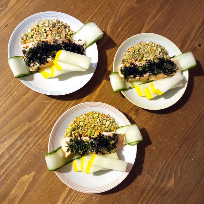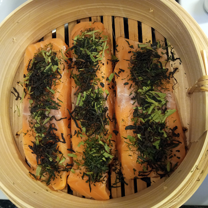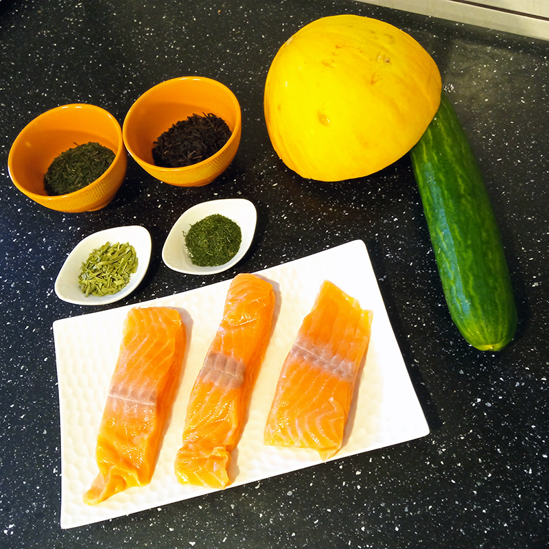Salmon, yellow melon, cucumber, aneth/dill, estragon/tarragon, Shizuoka Sencha Fukuju and Fujian Lapsang Souchong teas + a mix of dried vegetables (split peas, blond, green and coral lentils, soy flakes)